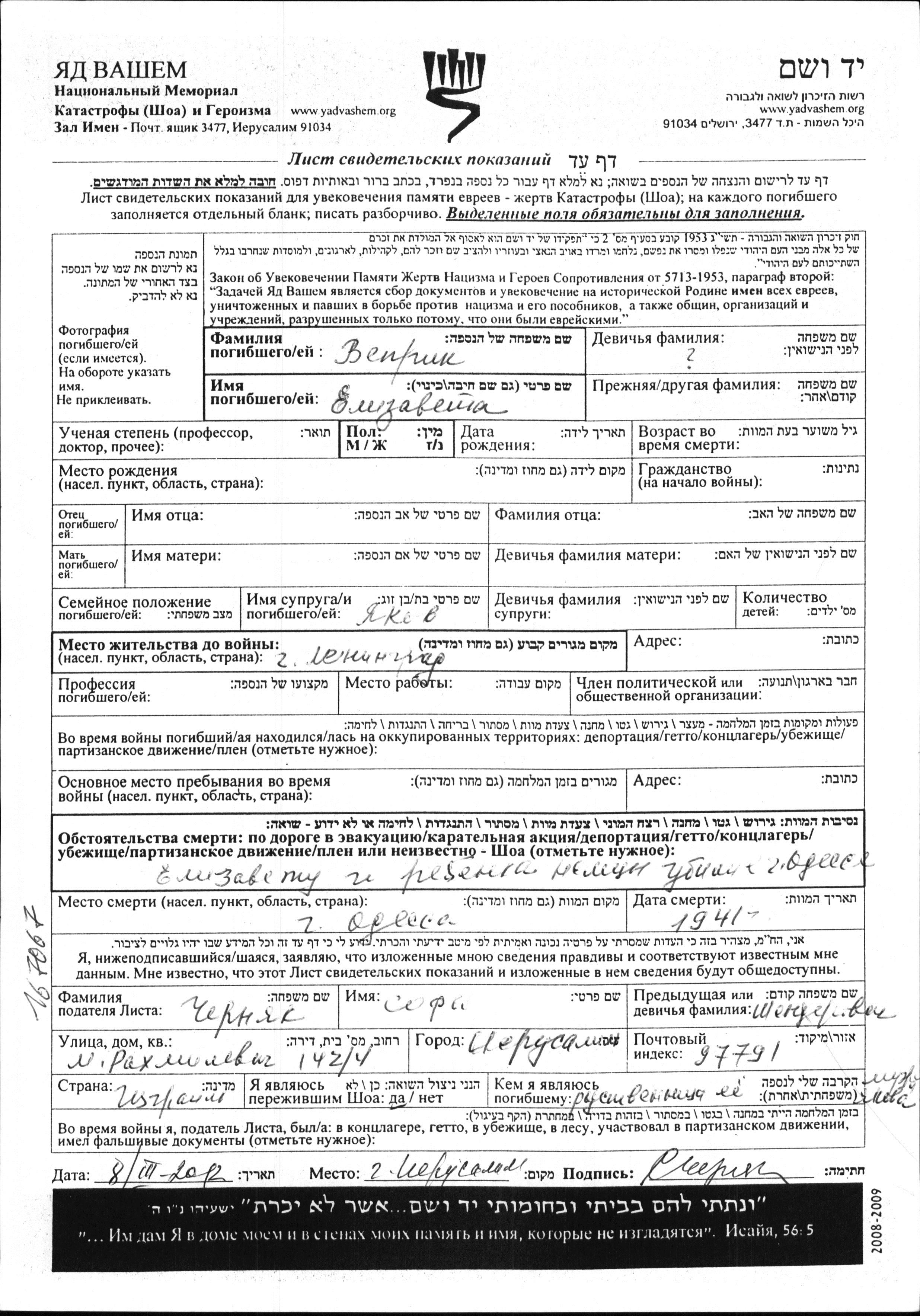 Yelizaveta wurde in der Schoah ermordet. Todesort: Odessa, Ukraine (UdSSR) im Jahr 1941.