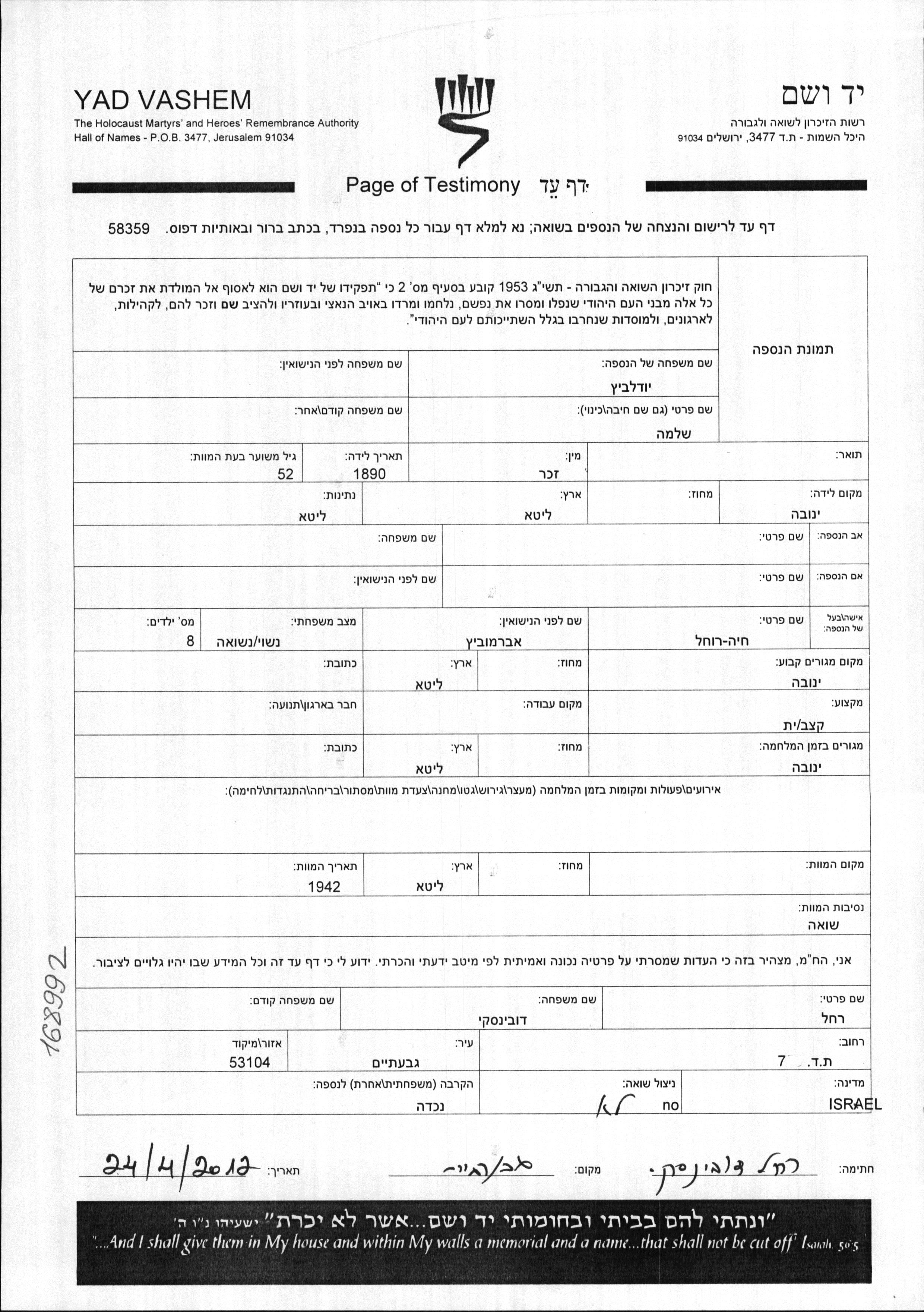 Shlomo Iudelevich wurde im Jahr 1890 in Yanova, Litauen geboren. Er war mit Chaia Rakhel, geb. Abramovitz Verheiratet. Vor dem Zweiten Weltkrieg lebte er in Yanova, Litauen. Während des Krieges war er in Yanova, Litauen.