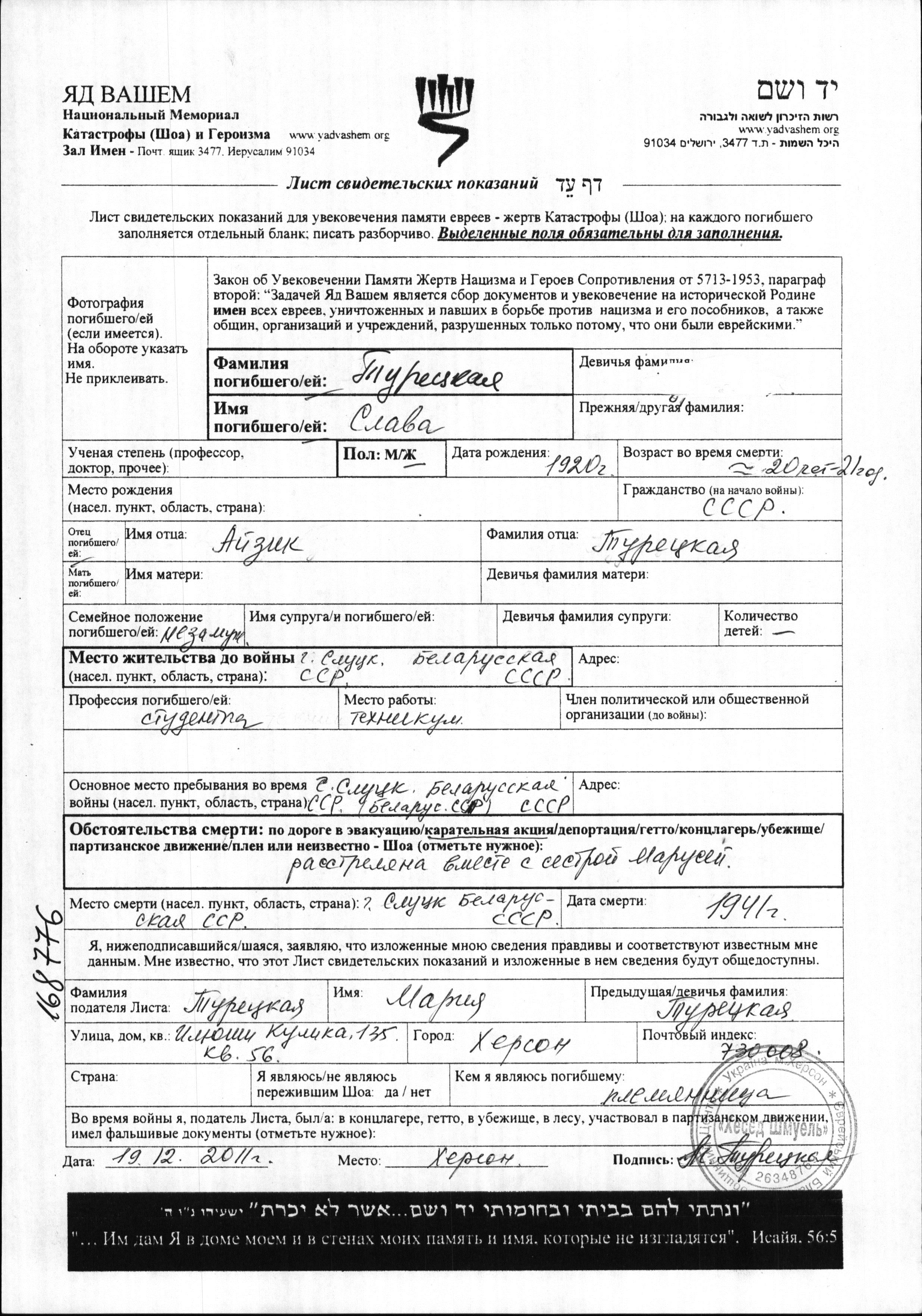 Slava wurde in der Schoah ermordet. Todesort: Slutsk, Weißrussland (UdSSR) im Jahr 1941.