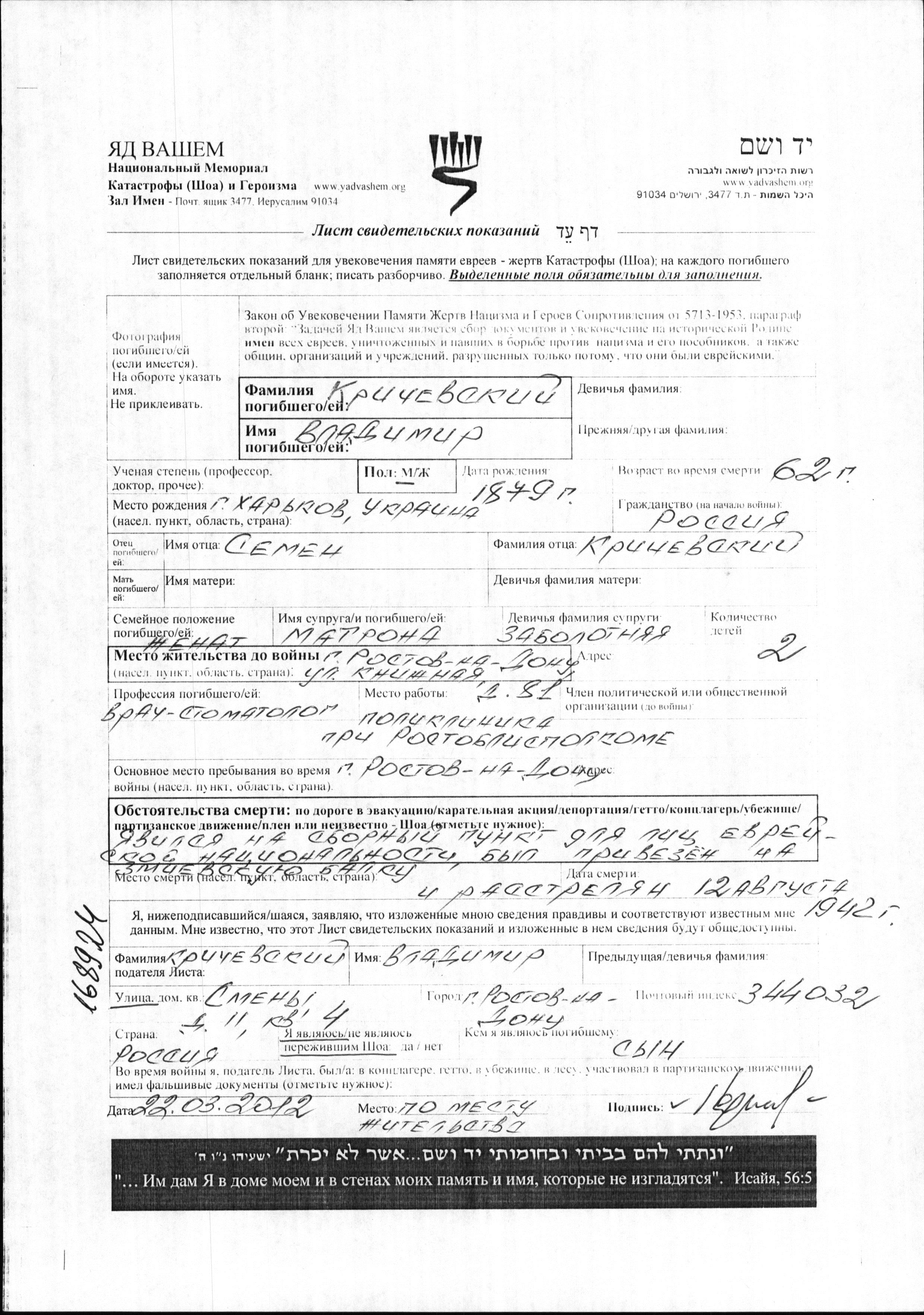 Vladimir Krichevski wurde im Jahr 1879 in Kharkov, Ukraine (UdSSR) geboren. Er war der Sohn von Semyon. Er war Dentistin und mit Matrona, geb. Zabolotnyaya Verheiratet. Vor dem Zweiten Weltkrieg lebte er in Rostov na Donu, Russland (UdSSR). Während des Krieges war er in Rostov na Donu, Russland (UdSSR).