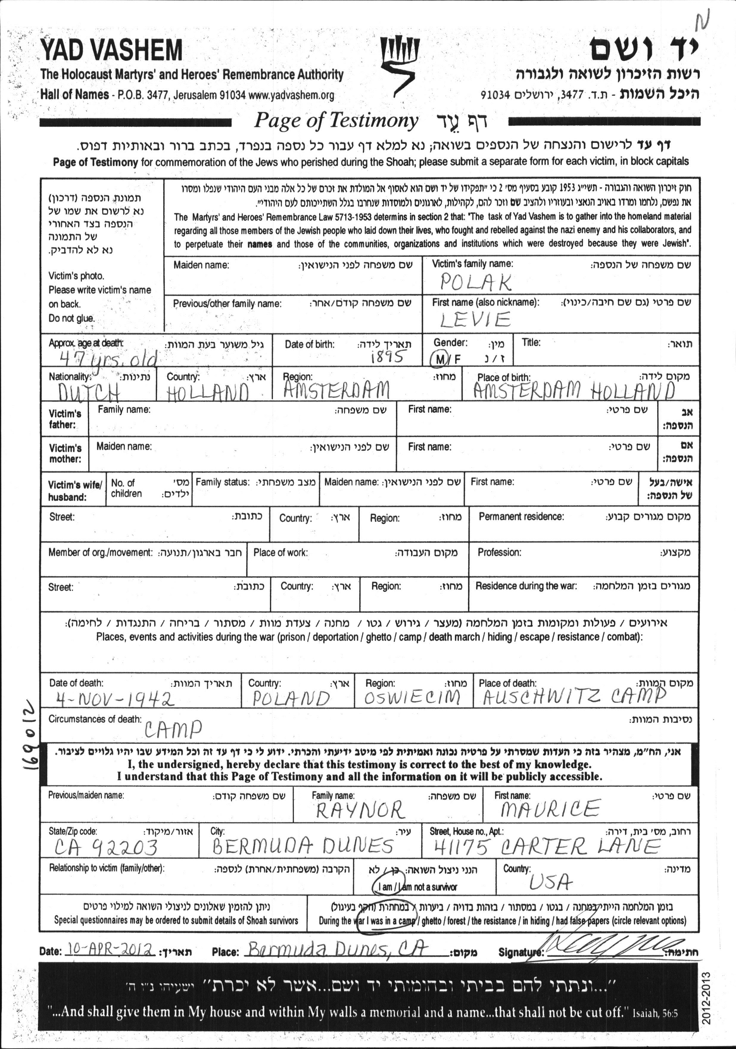 Levie wurde in der Schoah ermordet. Todesort: Auschwitz, Polen im Jahr 04/11/1942.