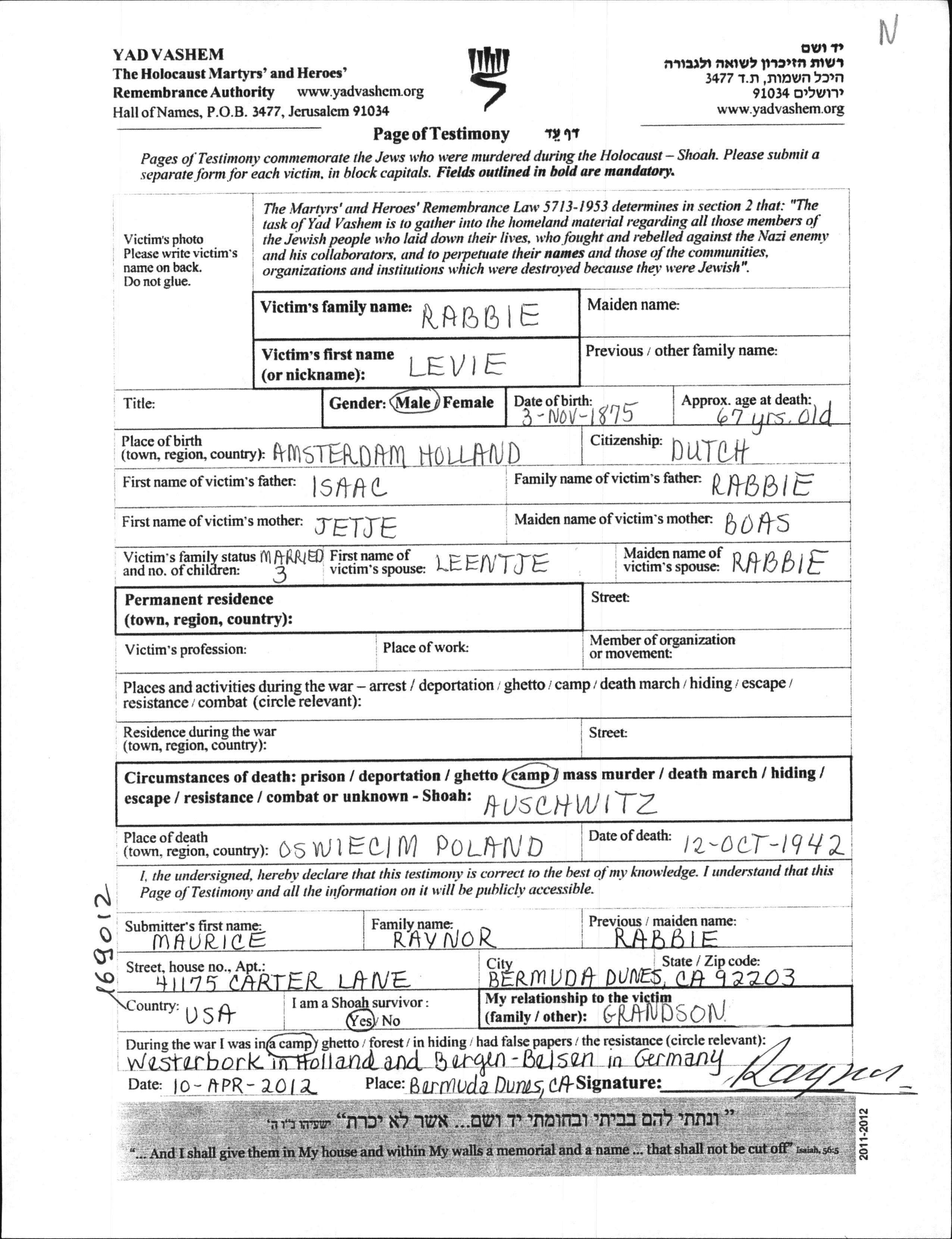 Levie wurde in der Schoah ermordet. Todesort: Auschwitz, Polen im Jahr 12/10/1942.