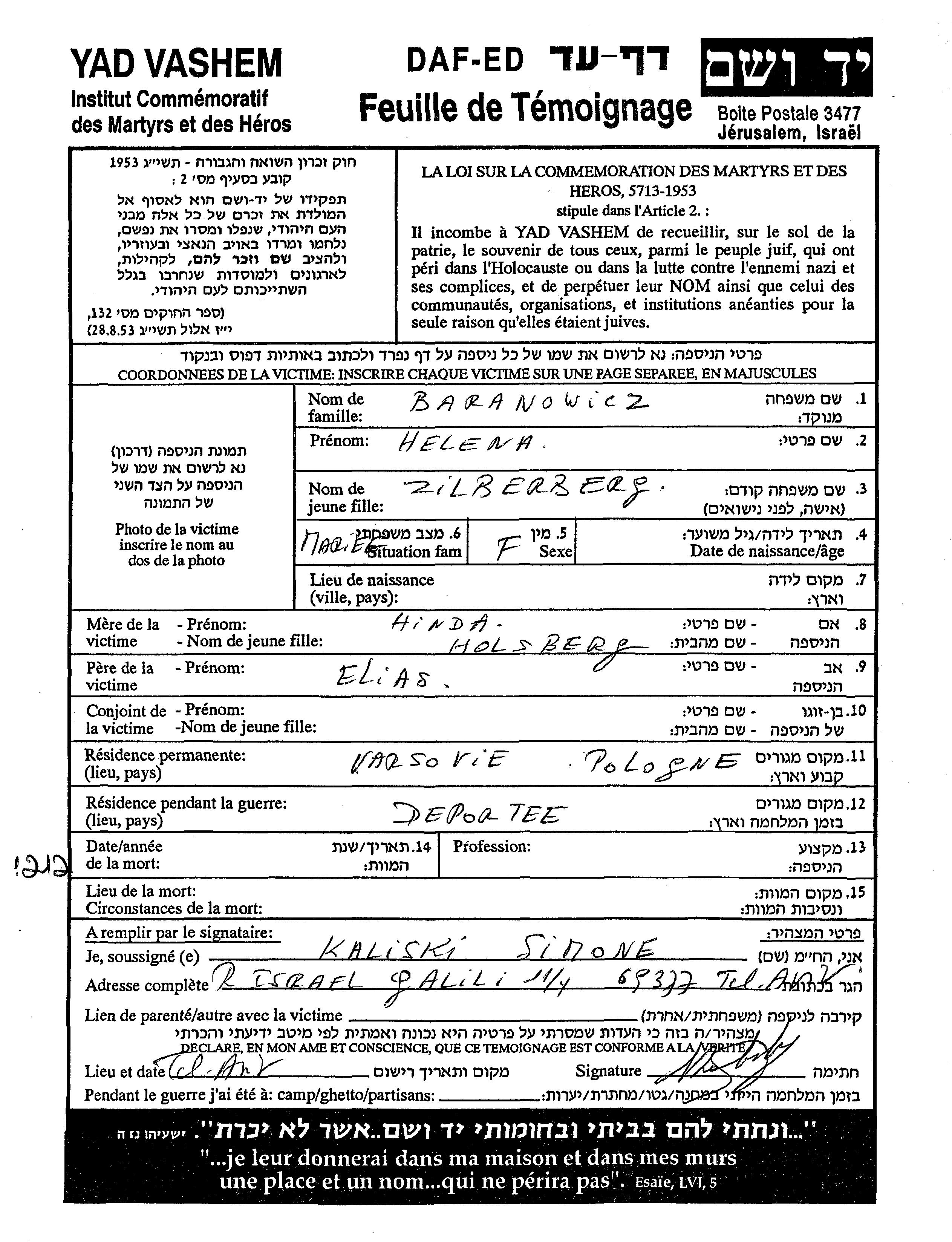 Helena Baranowicz, geb. Zilberberg wurde Sie war die Tochter von Elias und Hinda. Sie war Verheiratet. Vor dem Zweiten Weltkrieg lebte sie in Warsaw, Polen.