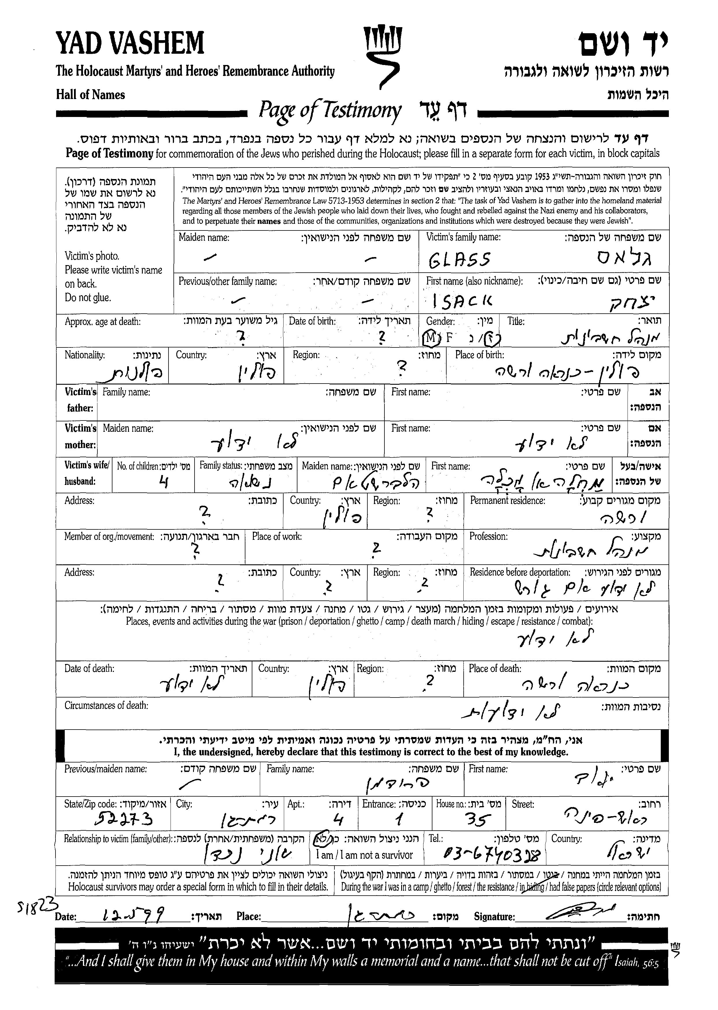 Isack Glass wurde in Polen geboren. Er war Buchhalter/-in und mit Makhla, geb. Halbershtam Verheiratet. Vor dem Zweiten Weltkrieg lebte er in Warsaw, Polen.