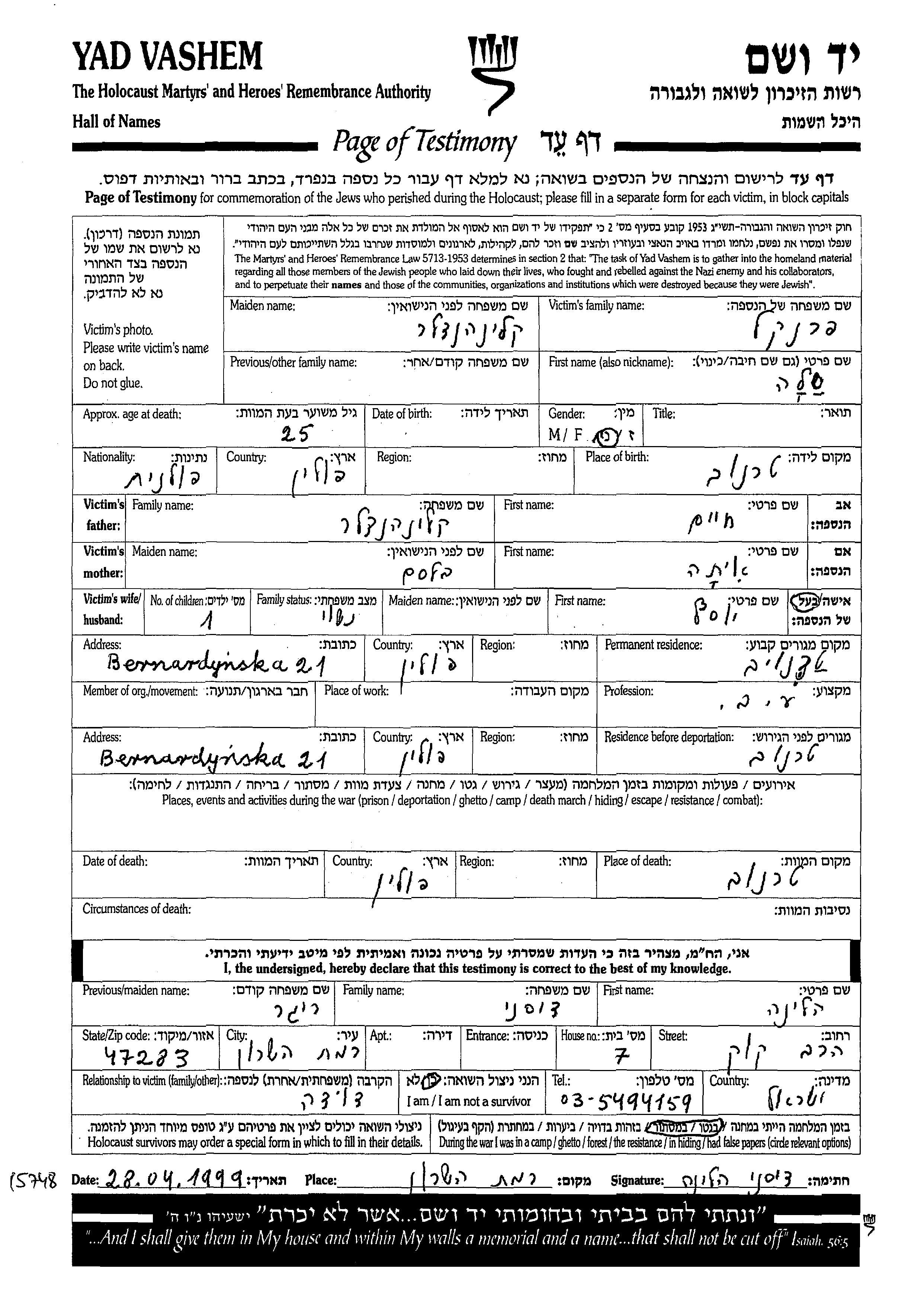 Sala Frenkel, geb. Kleinhendler wurde in Tarnow, Polen geboren. Sie war die Tochter von Khaim und Ita. Sie war Hausfrau und mit Yosef Verheiratet. Vor dem Zweiten Weltkrieg lebte sie in Tarnow, Polen. Während des Krieges war sie in Tarnow, Polen.