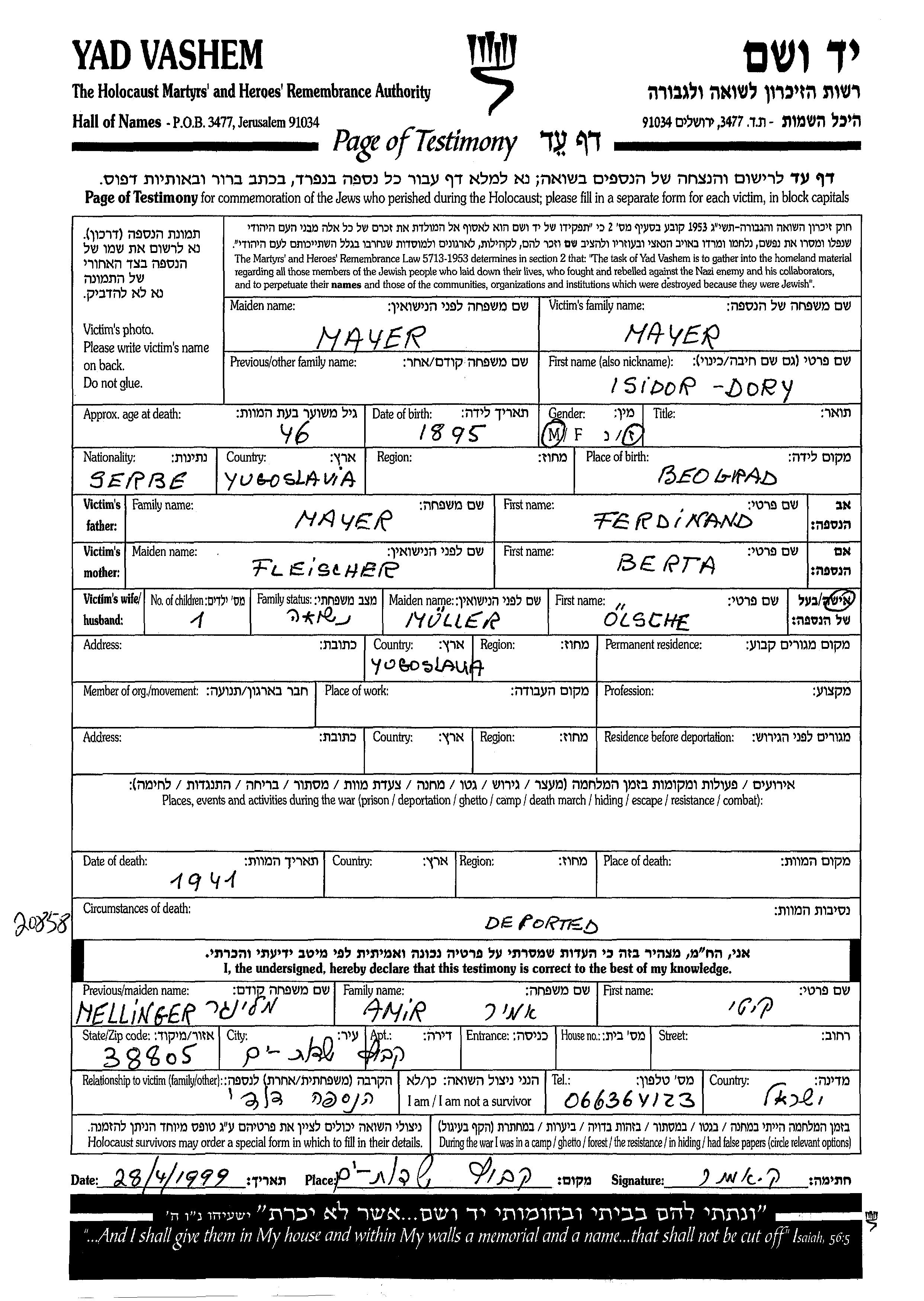 Isidor Dory Mayer wurde im Jahr 1895 in Beograd, Jugoslawien geboren. Er war der Sohn von Ferdinand und Berta. Er war mit Olsche, geb. Moller Verheiratet. Vor dem Zweiten Weltkrieg lebte er in Jugoslawien.