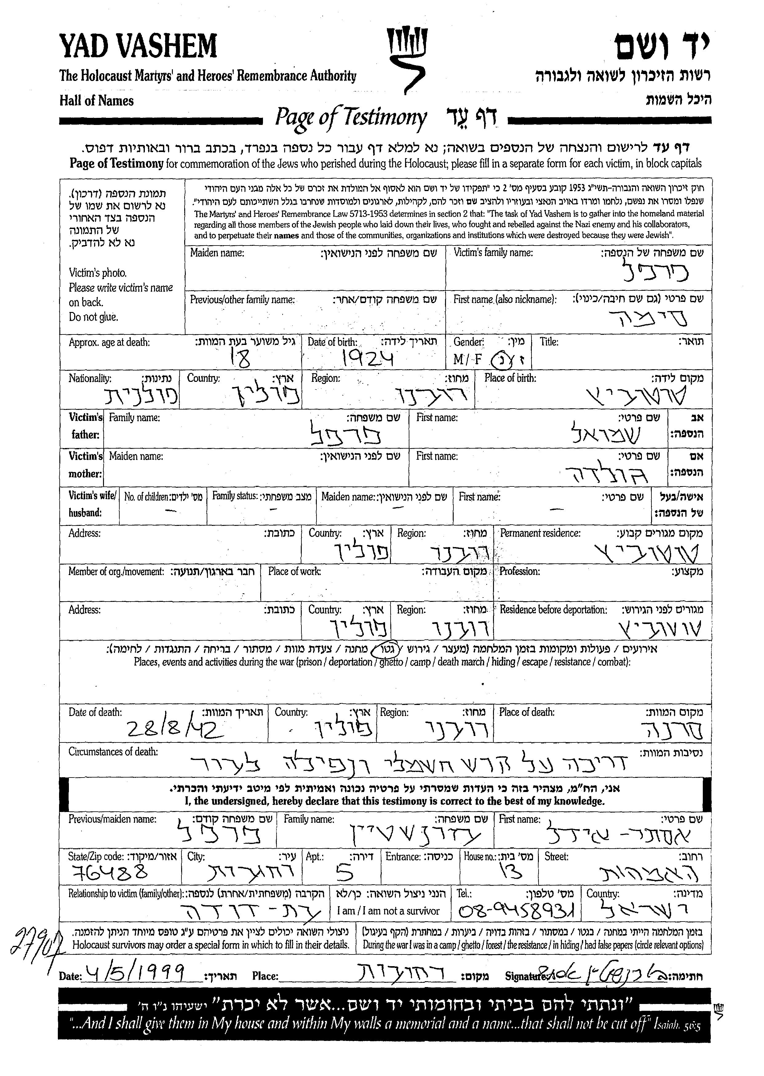 Sima wurde in der Schoah ermordet. Todesort: Serna, Polen im Jahr 28/08/1942.