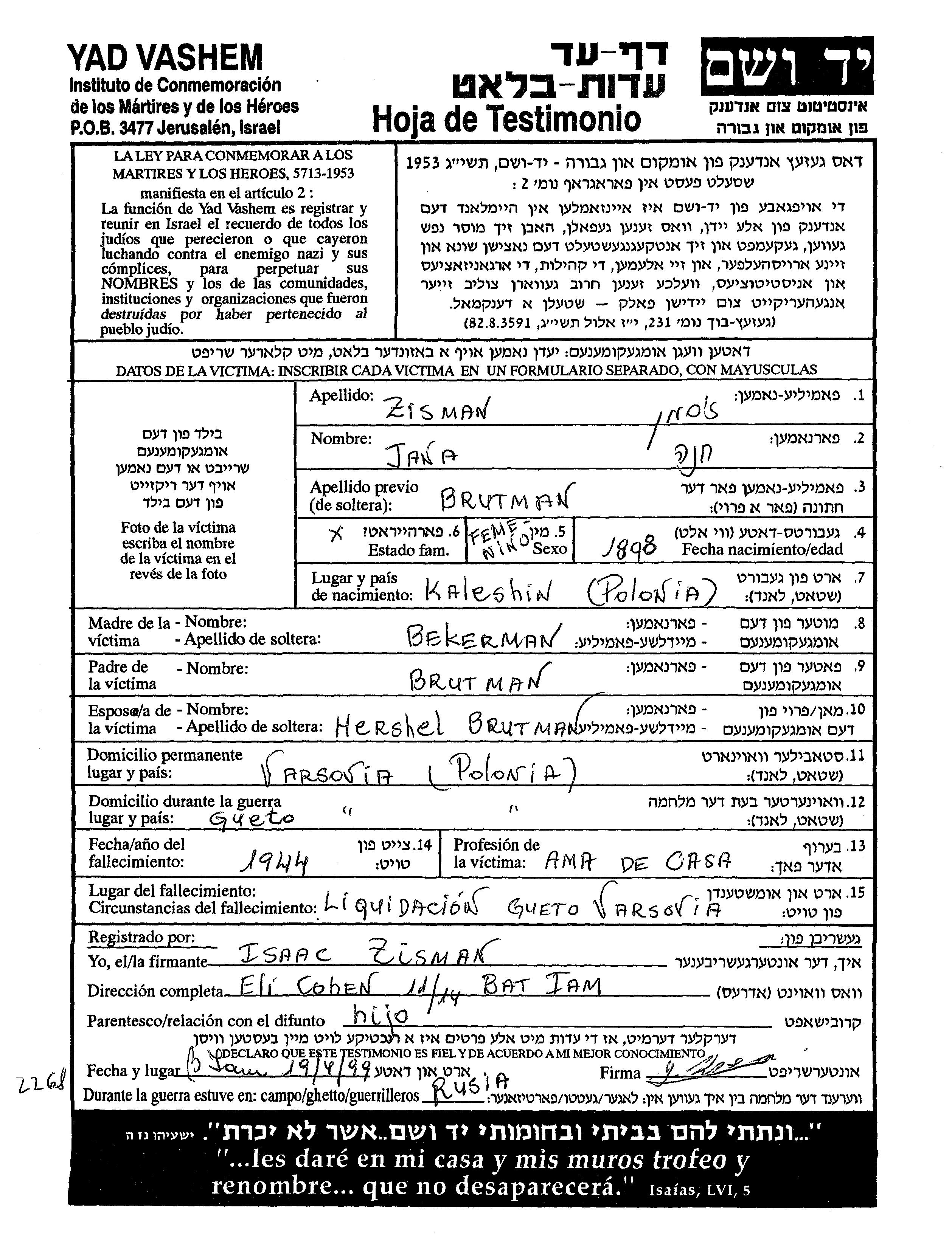 Jana Khana Zisman, geb. Brotman wurde im Jahr 1898 in Kalshin, Polen geboren. Sie war Hausfrau. Vor dem Zweiten Weltkrieg lebte sie in Varsovia, Polen. Während des Krieges war sie in Varsovia, Polen.