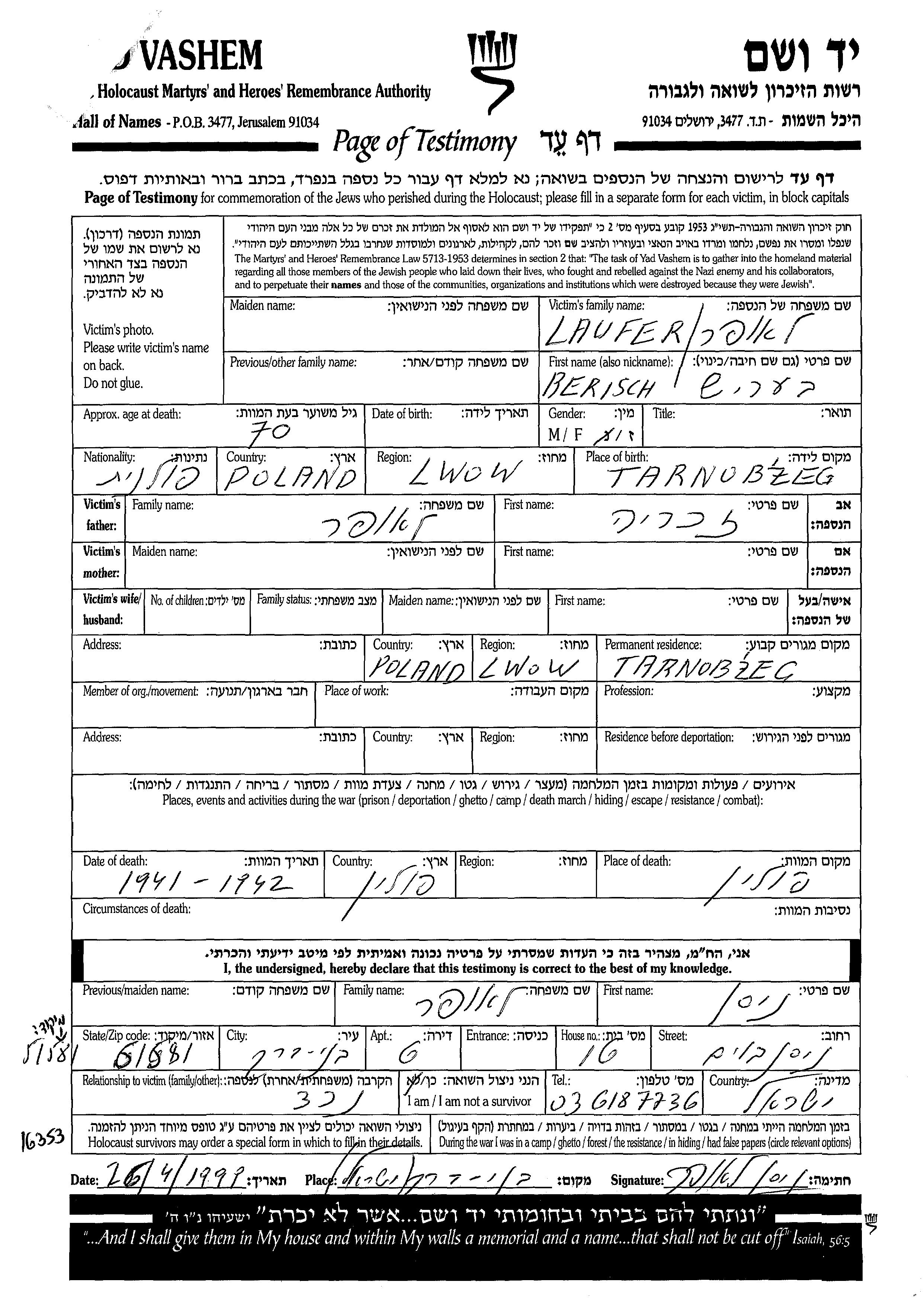 Berisch Laufer wurde in Tarnobzek, Polen geboren. Er war der Sohn von Zakharia. Vor dem Zweiten Weltkrieg lebte er in Tarnobzek, Polen.