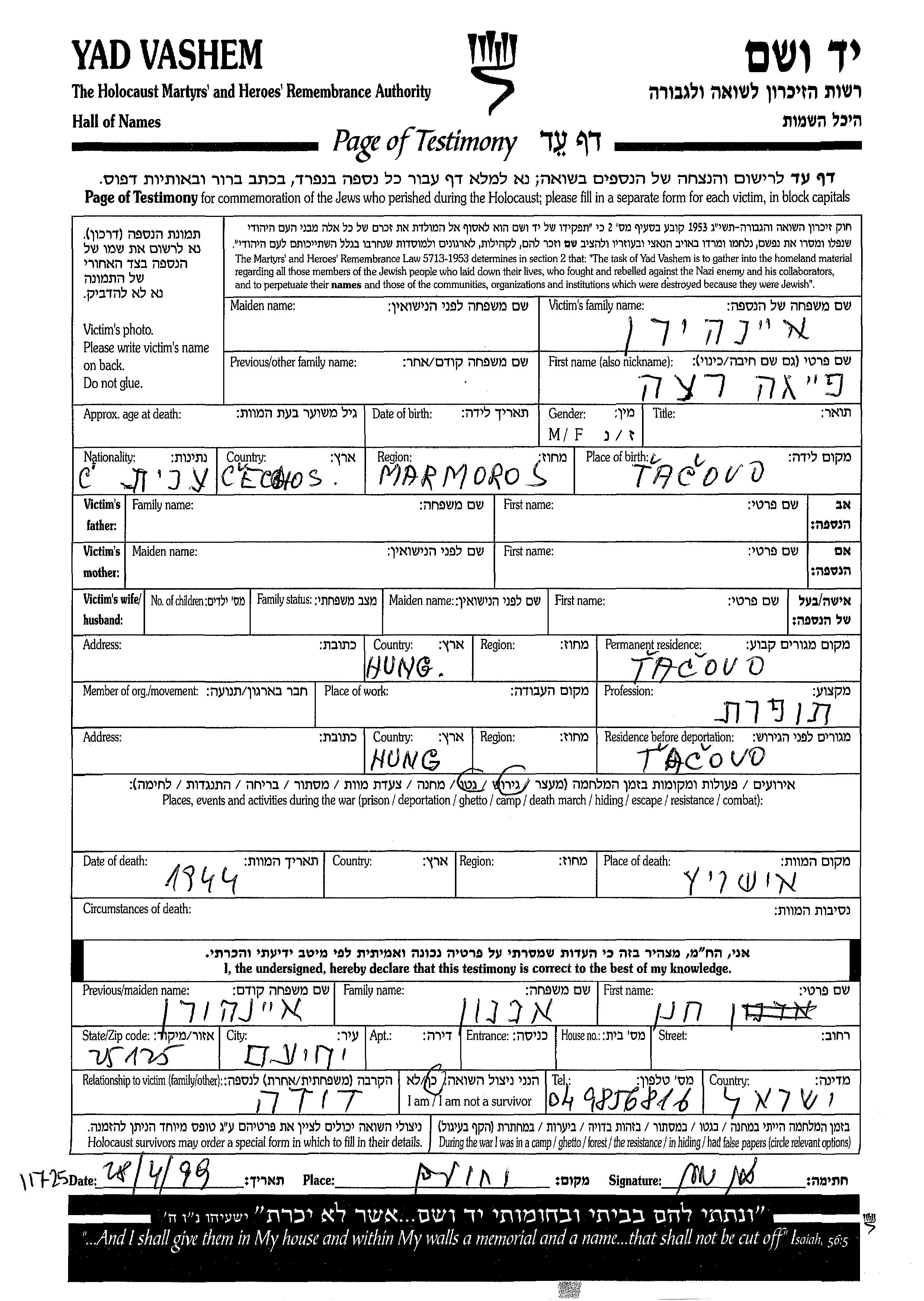 Feiga Ratza Einhorn wurde in Tacovo, Tschechoslowakei geboren. Sie war Schneiderin. Vor dem Zweiten Weltkrieg lebte sie in Tacovo, Tschechoslowakei. Während des Krieges war sie in Tacovo, Tschechoslowakei.