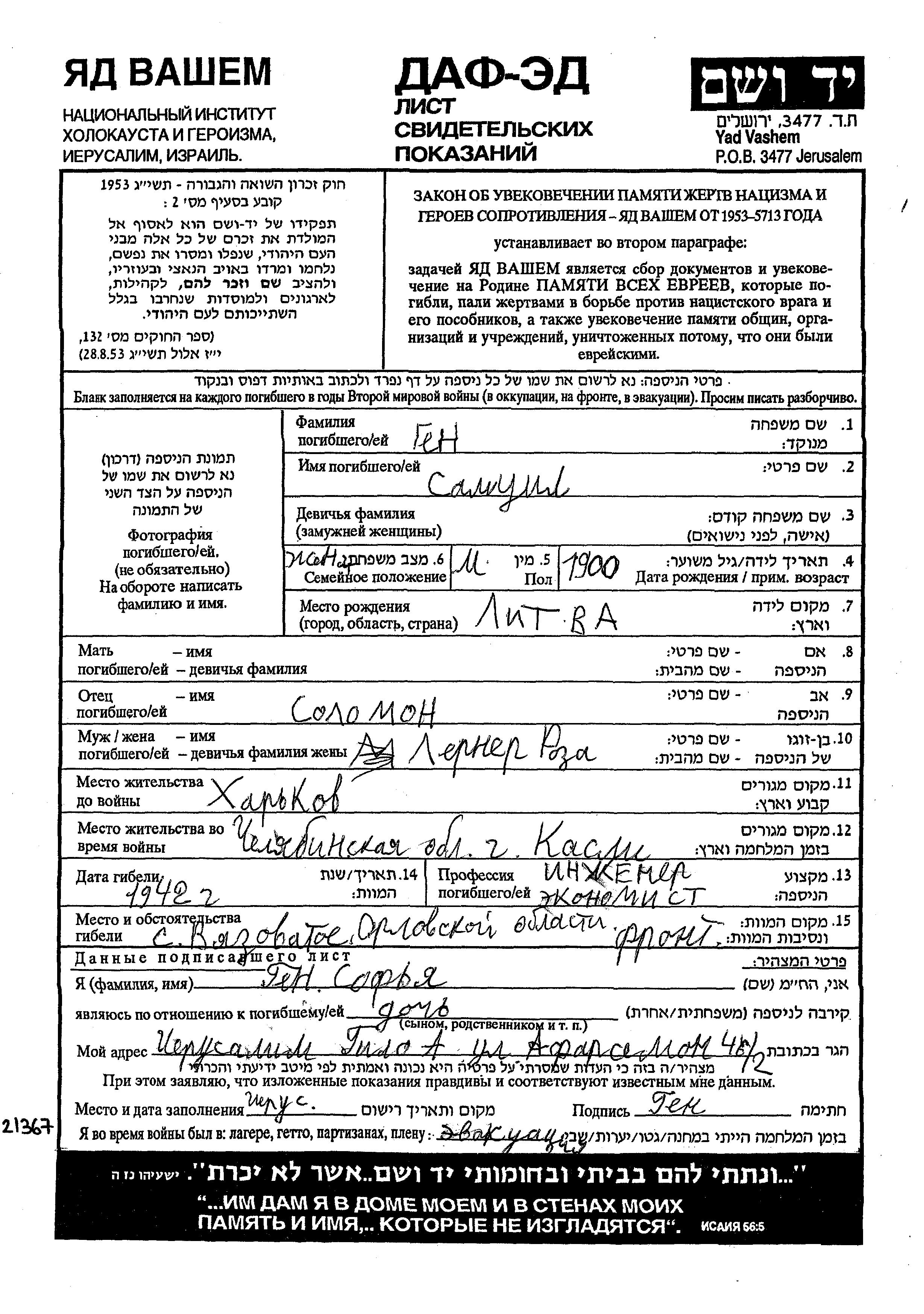Samuil Gen wurde im Jahr 1900 in Litauen geboren. Er war der Sohn von Solomon. Er war Engineer economist und mit Rosa Verheiratet. Vor dem Zweiten Weltkrieg lebte er in Kharkov, Ukraine (UdSSR). Während des Krieges war er in Kasli, Russland (UdSSR). Samuil im Militärdienst umgekommen. Todesort: die Sowjetischen Streitkräfte im Jahr 1942.