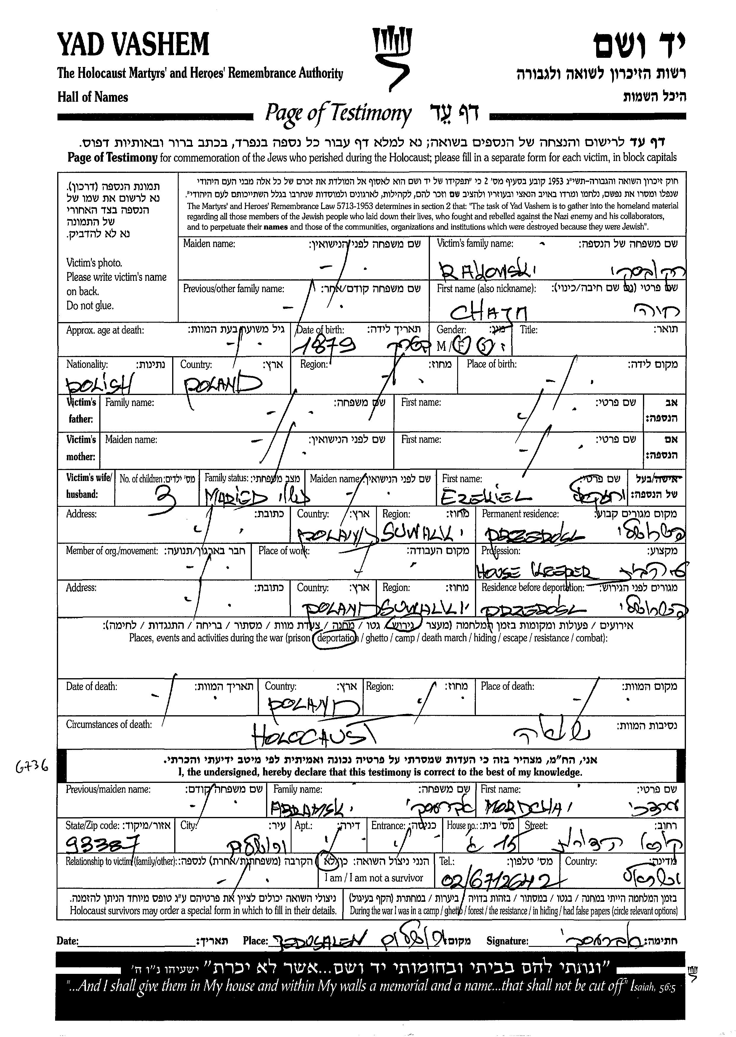 Chaja Rakowski wurde im Jahr 1879 in Polen geboren. Sie war Hausfrau und mit Ezekiel Verheiratet. Vor dem Zweiten Weltkrieg lebte sie in Przerosl, Polen. Während des Krieges war sie in Przerosl, Polen.