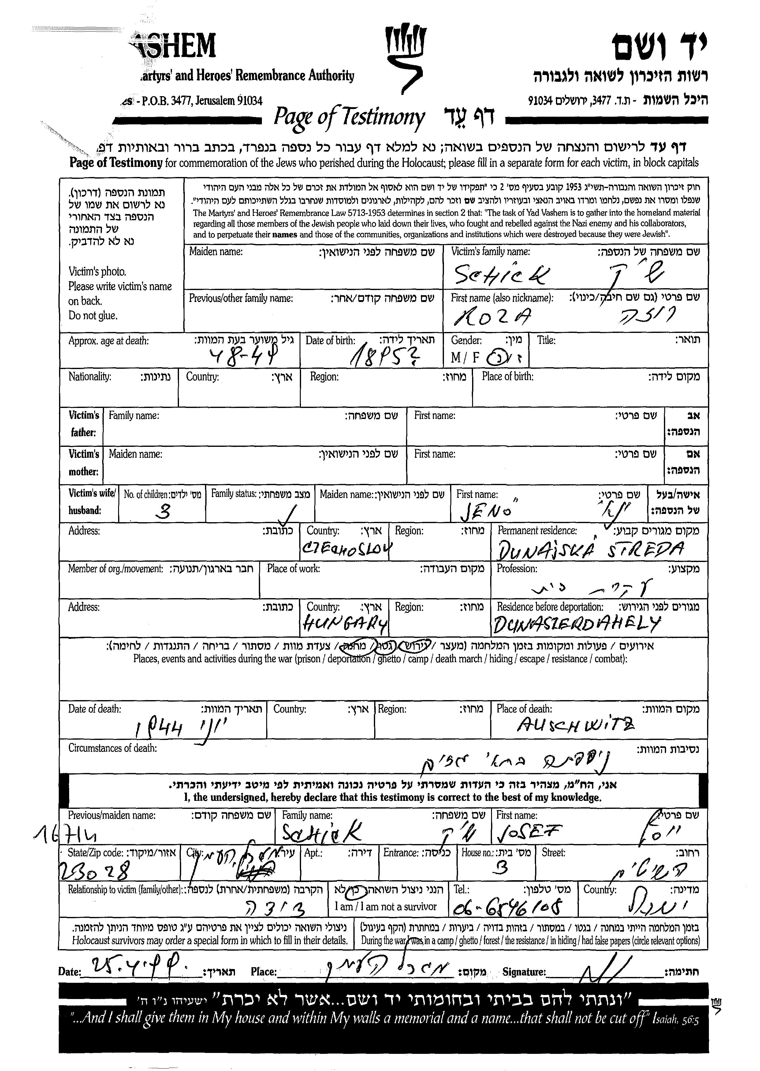 Roza Schick wurde im Jahr 1895 geboren. Sie war Hausfrau und mit Jeno Yanay Verheiratet. Vor dem Zweiten Weltkrieg lebte sie in Dunajska Streda, Tschechoslowakei. Während des Krieges war sie in Dunaszerdahely, Tschechoslowakei.