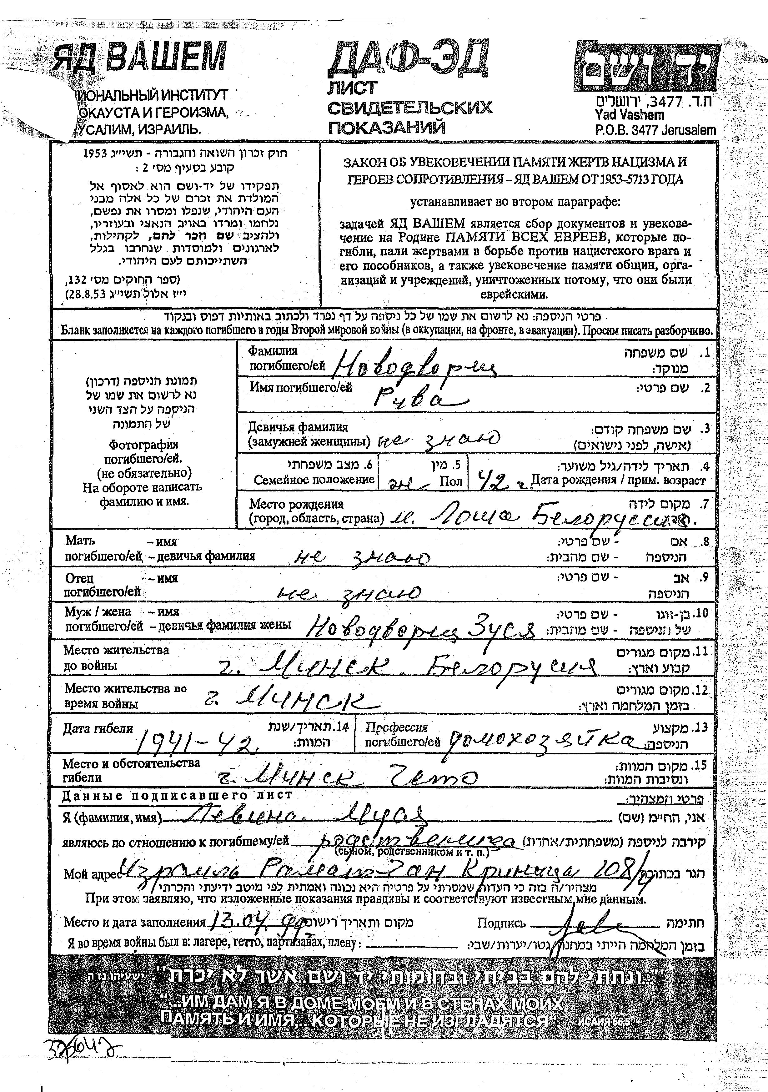 Riva Novodvoretz wurde in Losha, Weißrussland (UdSSR) geboren. Sie war Hausfrau und mit Zusya Verheiratet. Vor dem Zweiten Weltkrieg lebte sie in Minsk, Weißrussland (UdSSR). Während des Krieges war sie in Minsk, Weißrussland (UdSSR).