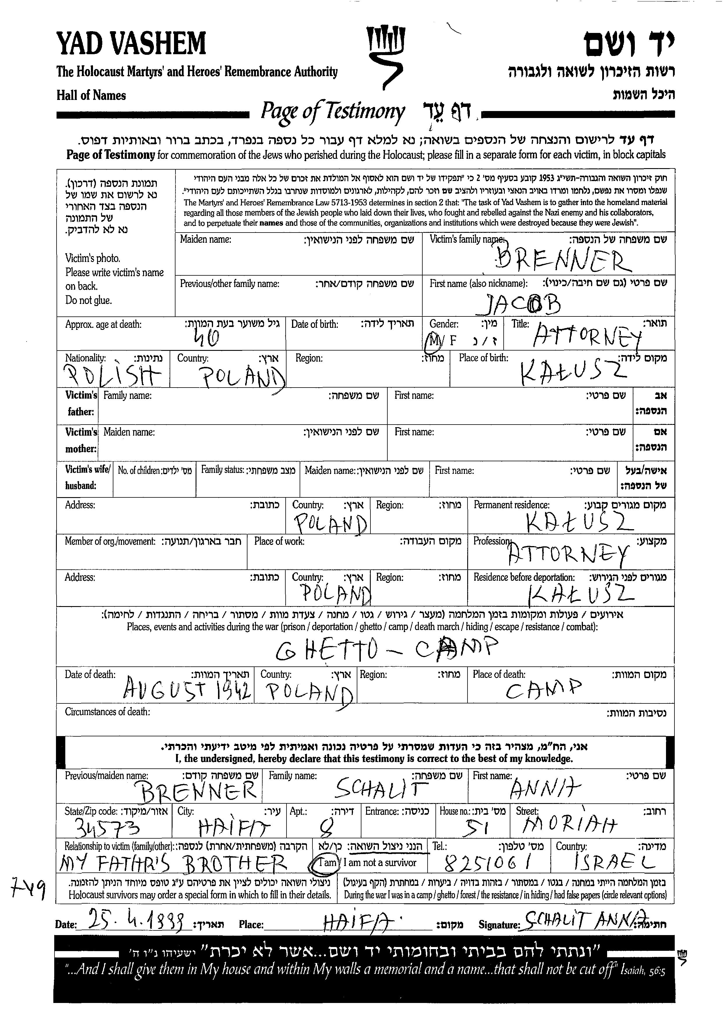 Jacob Brenner wurde in Kalusz, Polen geboren. Er war Jurist. Vor dem Zweiten Weltkrieg lebte er in Kalusz, Polen. Während des Krieges war er in Kalusz, Polen. Jacob wurde in der Schoah ermordet. Todesort: Lager, Polen im Jahr 08/1942.
