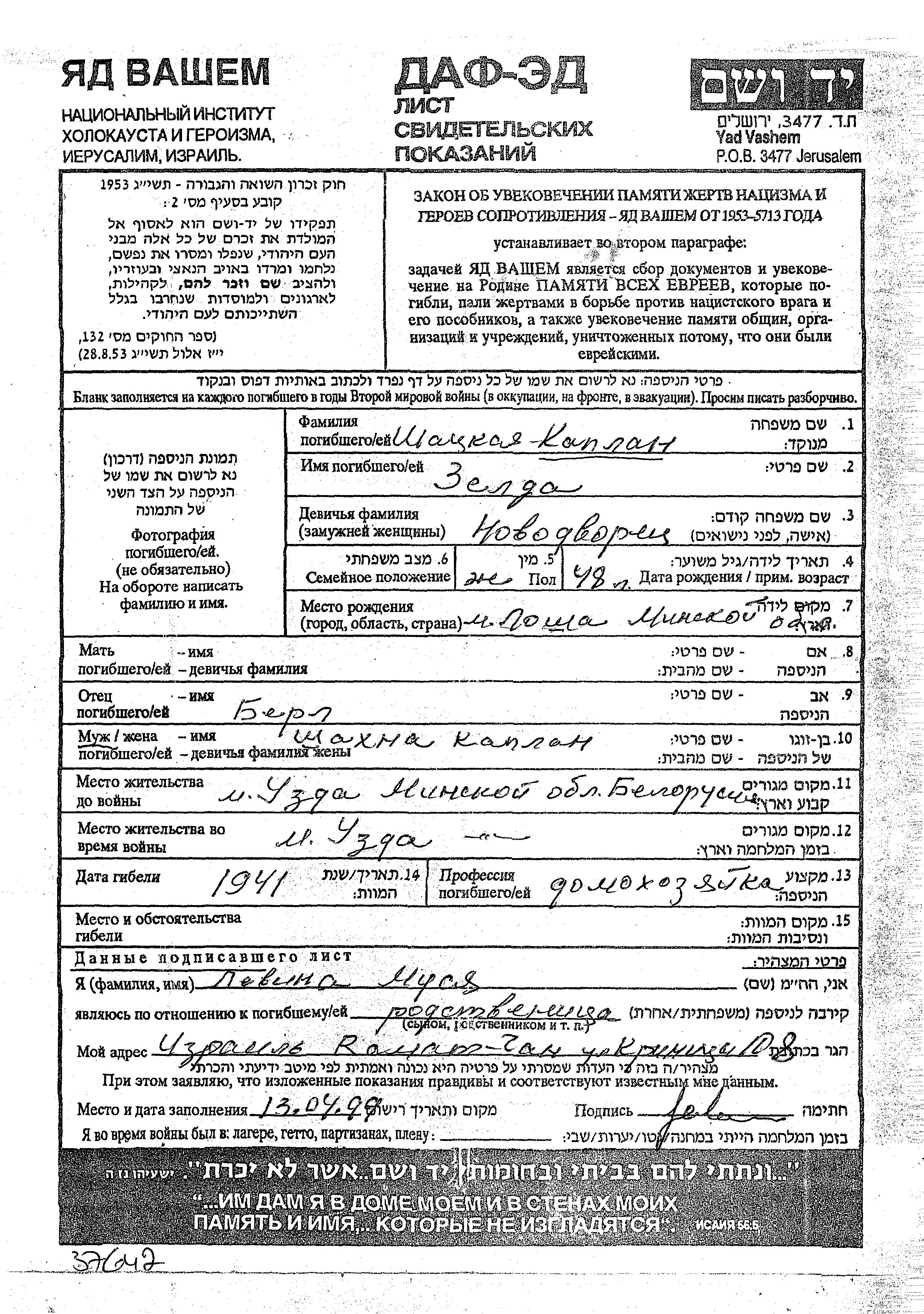 Kaplan Shatzki Zelda Uzda, Weißrussland (UdSSR) Gedenkblatt