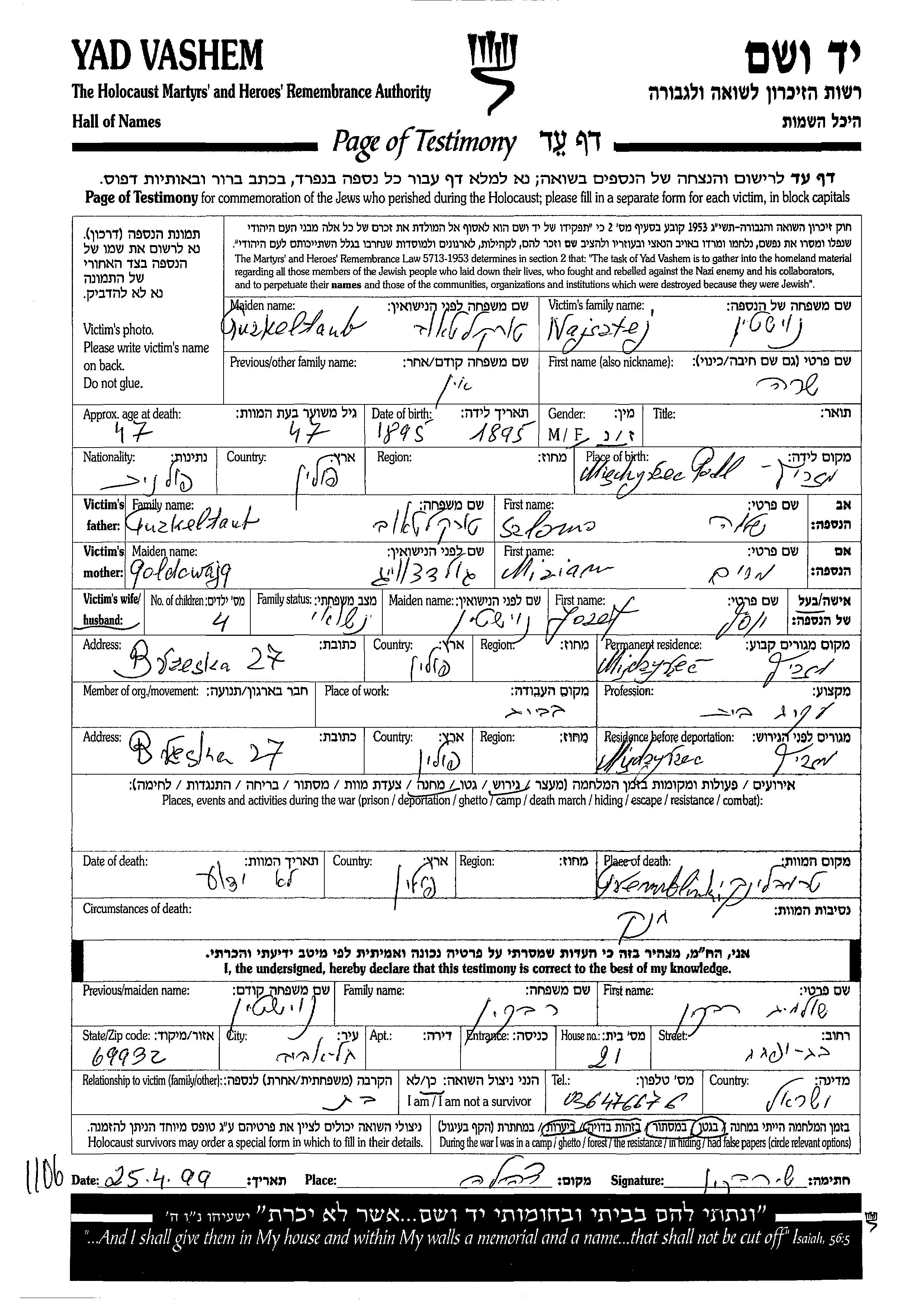 Sara Najsztejn, geb. Turkeltaub wurde im Jahr 1895 in Miedzyrzec, Polen geboren. Sie war die Tochter von Szlomo und Miriam. Sie war Hausfrau und mit Jozef, geb. Noishtein Verheiratet. Vor dem Zweiten Weltkrieg lebte sie in Miedzyrzec, Polen. Während des Krieges war sie in Miedzyrzec, Polen.
