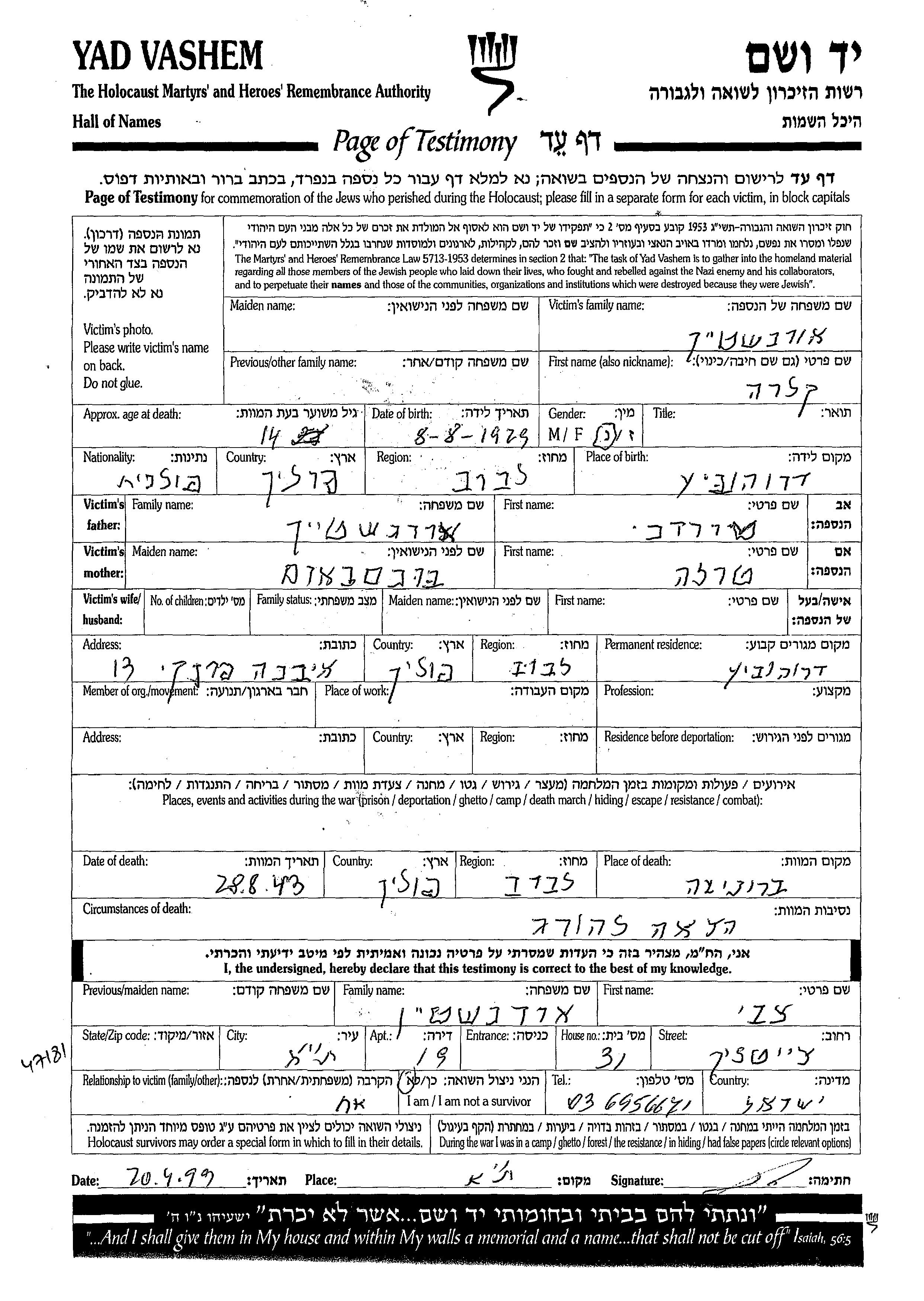 Orenshtein Klara 1929 Drohobycz, Polen Gedenkblatt