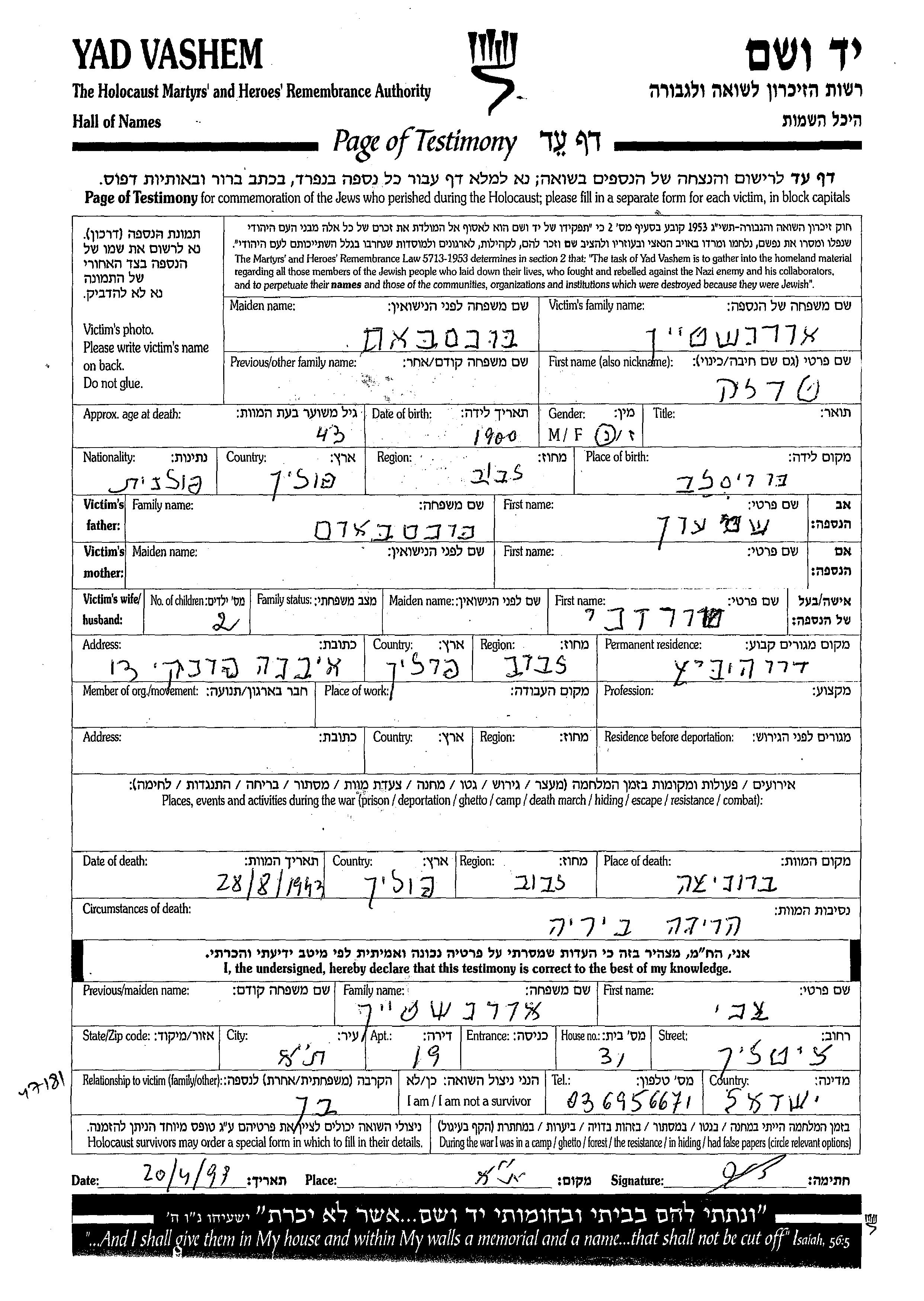 Tereza wurde in der Schoah ermordet. Todesort: Bronica, Polen im Jahr 28/08/1943.
