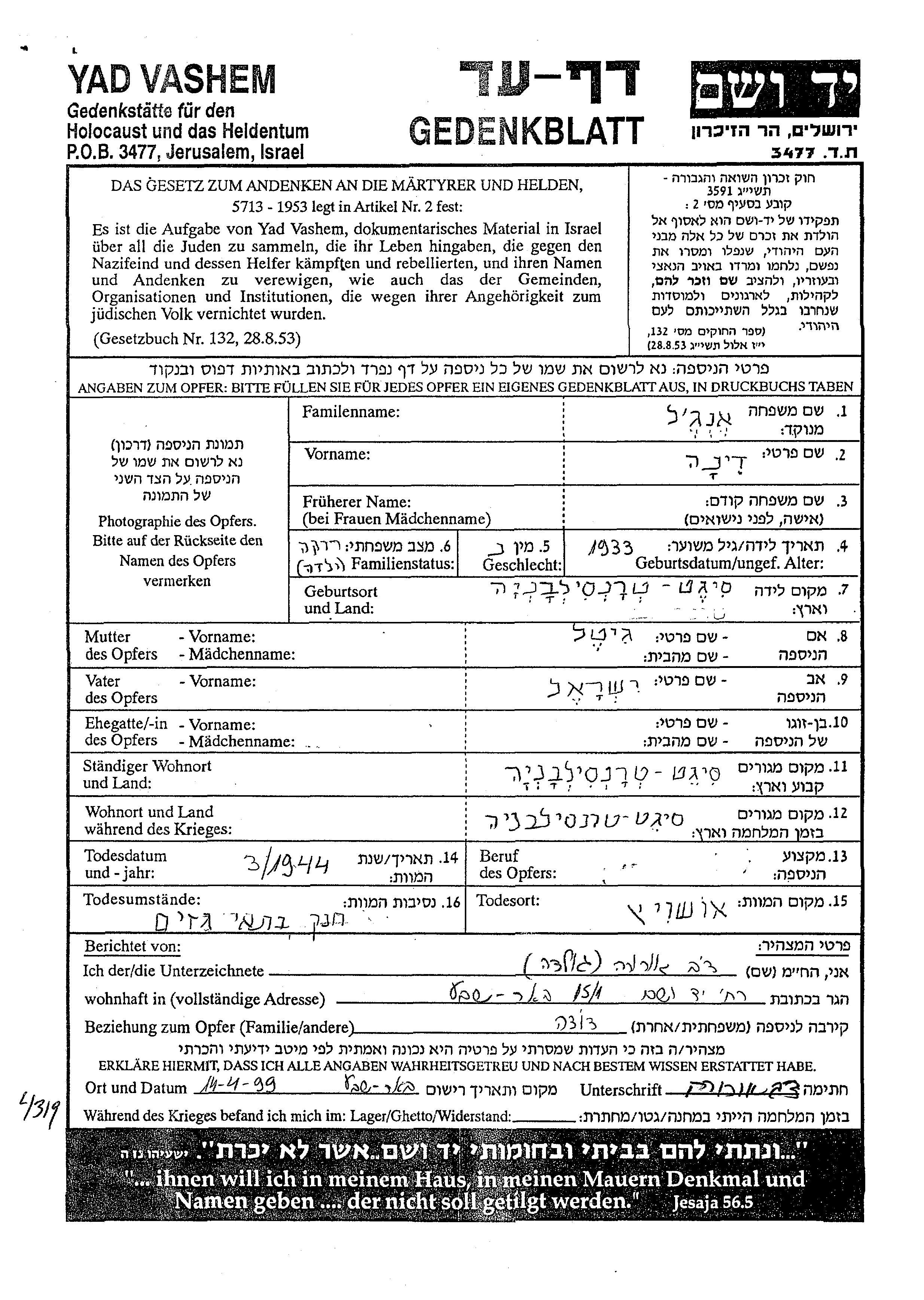 Dina Angel wurde im Jahr 1933 in Siget, Rumänien geboren. Sie war die Tochter von Yisrael und Gitel. Sie war Ledig. Vor dem Zweiten Weltkrieg lebte sie in Siget, Rumänien. Während des Krieges war sie in Siget, Rumänien.