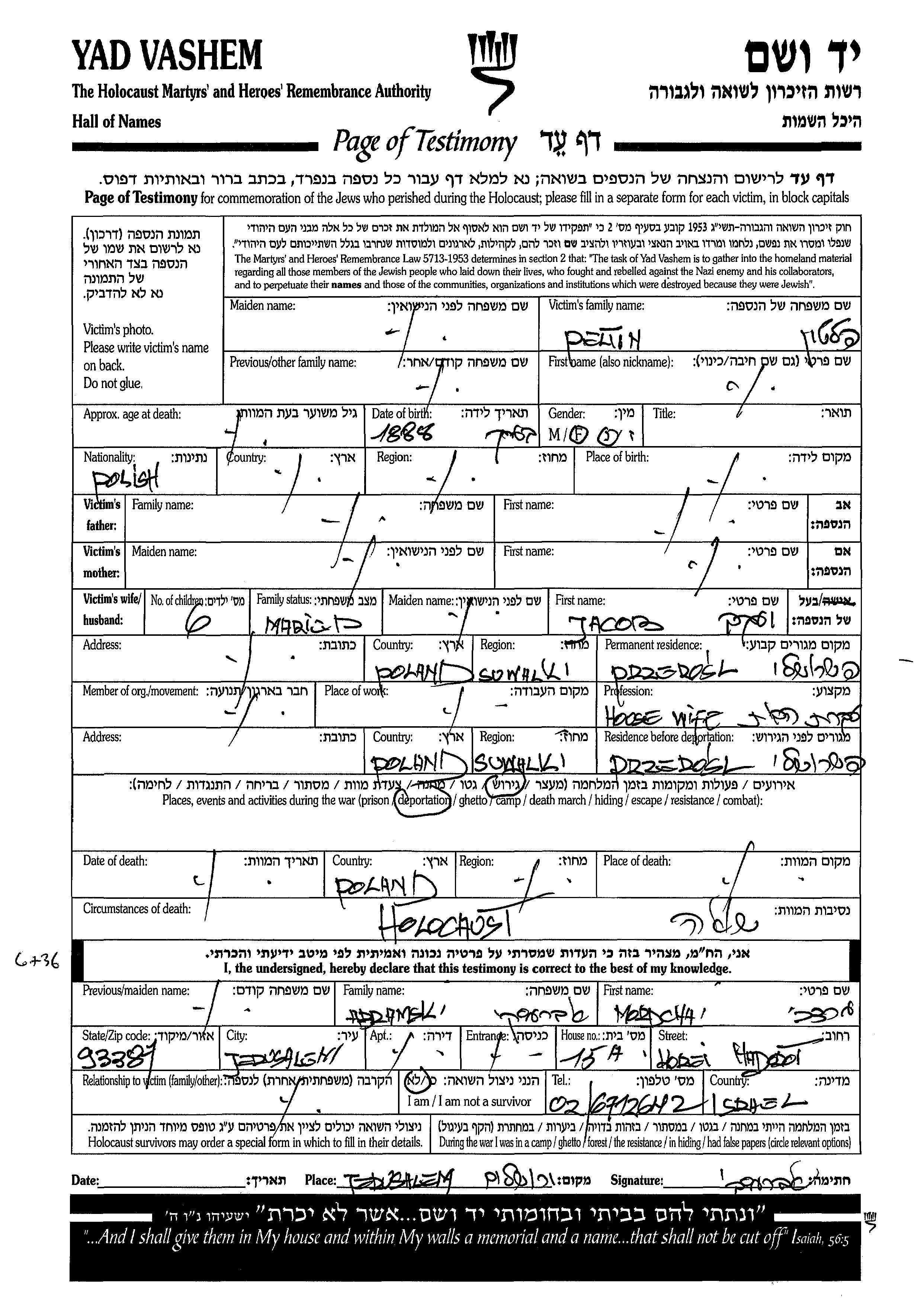 Vorname unbekannt Peltin wurde im Jahr 1888 in Polen geboren. Sie war Hausfrau und mit Jacob Verheiratet. Vor dem Zweiten Weltkrieg lebte sie in Przerosl, Polen. Während des Krieges war sie in Przerosl, Polen.