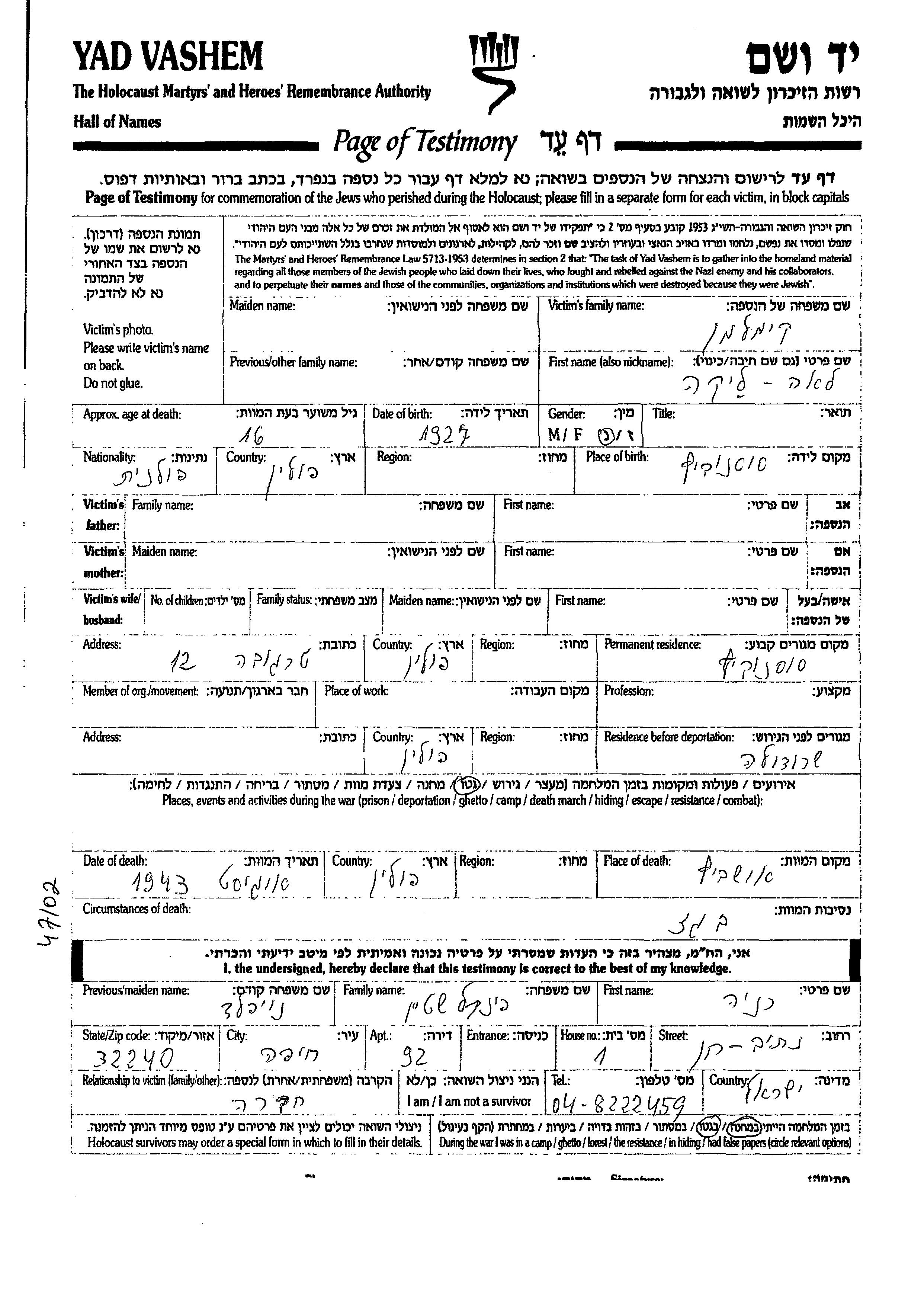Kimelman Lea Lika 1927 Sosnovice, Polen Gedenkblatt