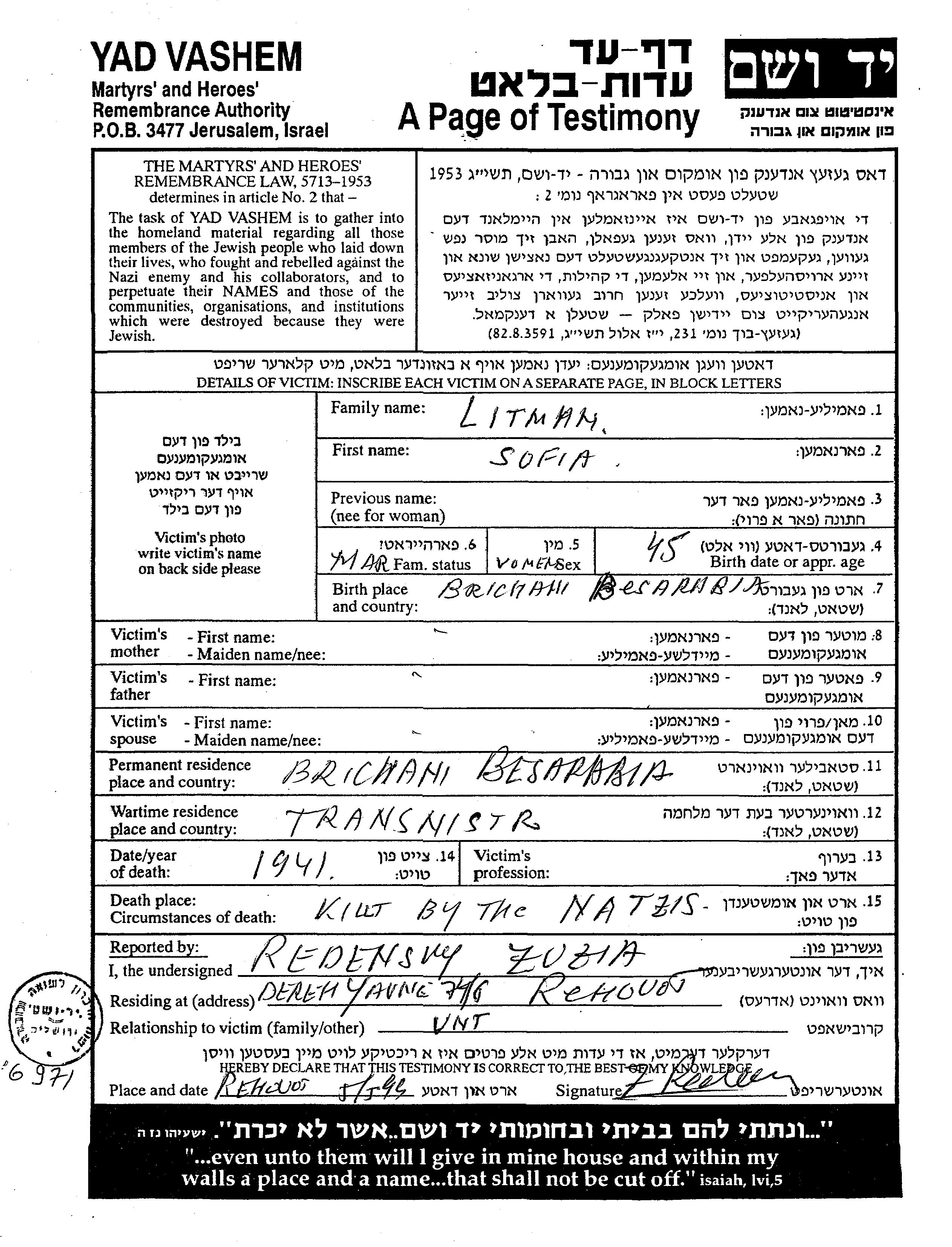 Sofia Litman wurde in Brichany, Rumänien geboren. Sie war Verheiratet. Vor dem Zweiten Weltkrieg lebte sie in Brichany, Rumänien. Während des Krieges war sie in Transnistria, Ukraine (UdSSR).