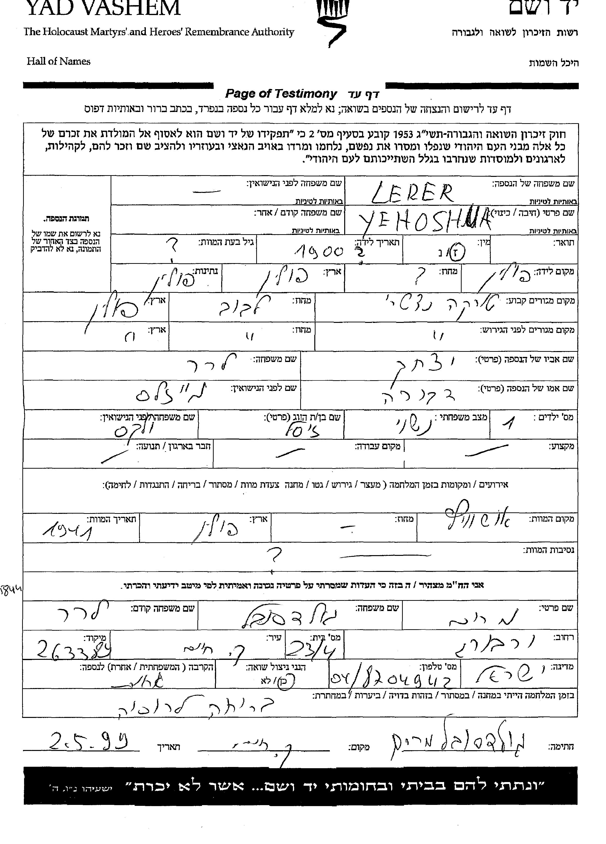 Yehoshua Lerer wurde im Jahr 1900 in Polen geboren. Er war der Sohn von Yitzkhak und Dvora. Er war mit Zysl, geb. Velkes Verheiratet. Vor dem Zweiten Weltkrieg lebte er in Turka nad Stryjem, Polen. Während des Krieges war er in Turka nad Stryjem, Polen.