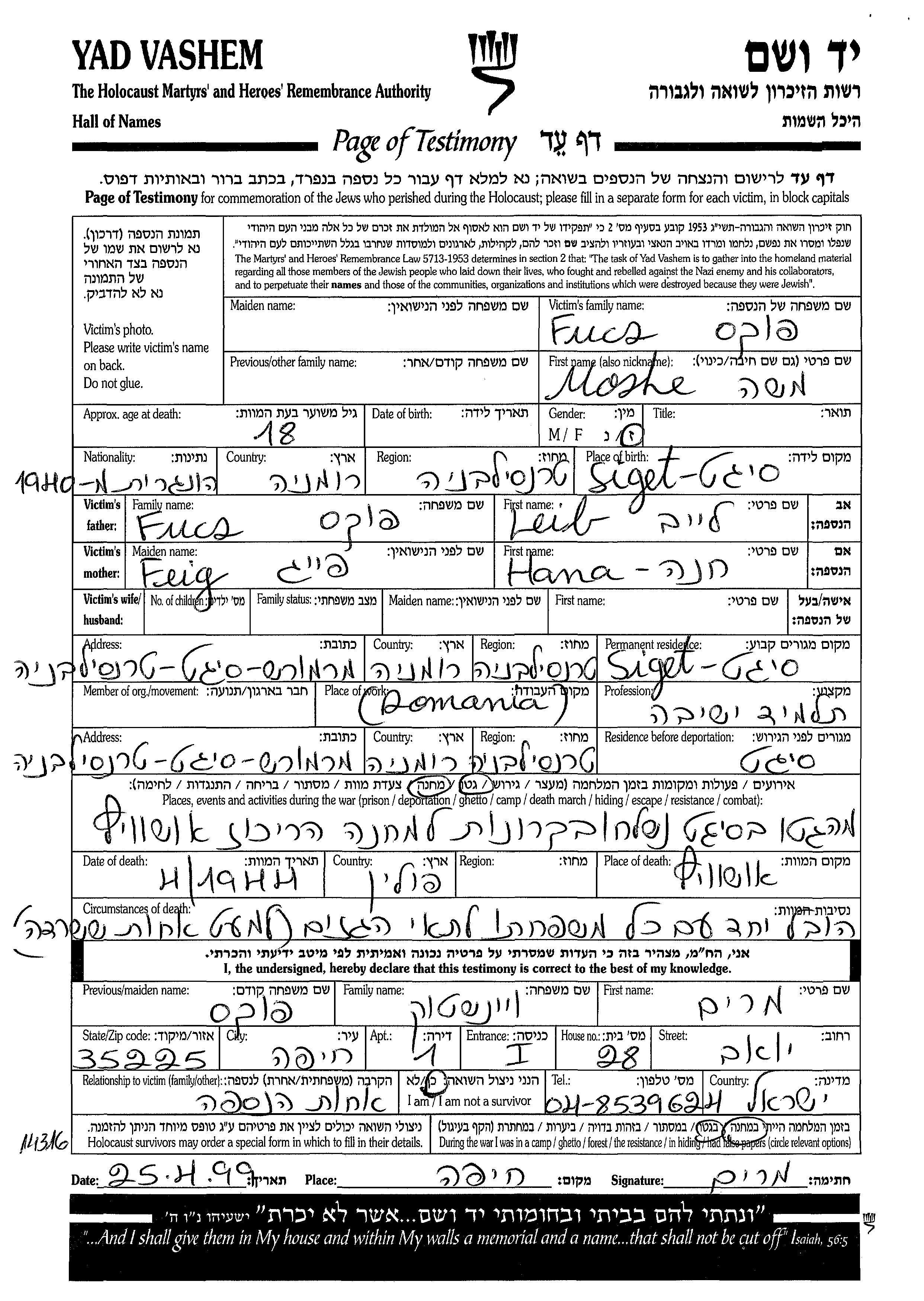 Moshe wurde in der Schoah ermordet. Todesort: Auschwitz, Polen im Jahr 04/1944.