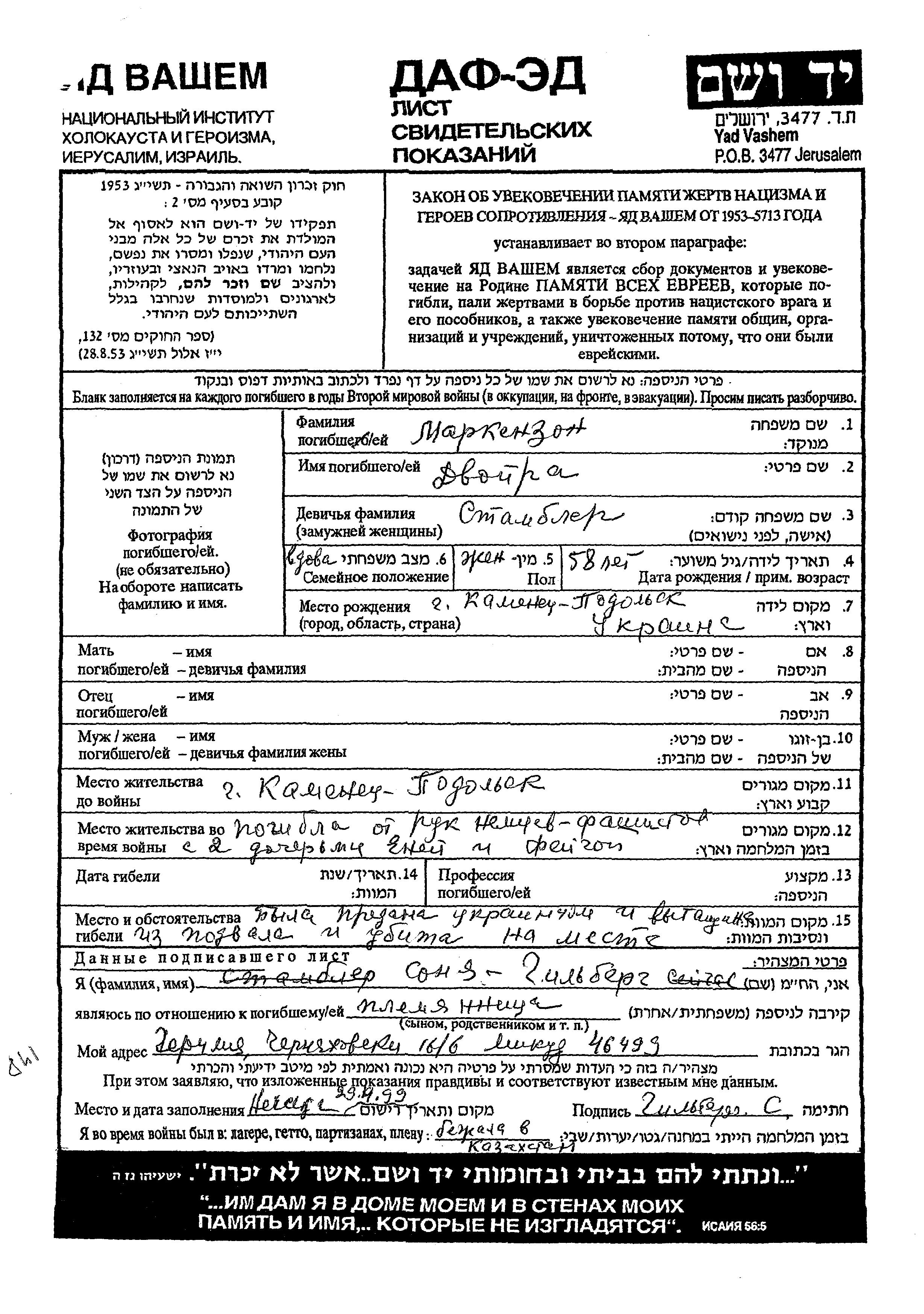 Dvoira Markenzon, geb. Stambler wurde in Kamenets Podolskiy, Ukraine (UdSSR) geboren. Sie war Verheiratet. Vor dem Zweiten Weltkrieg lebte sie in Kamenets Podolskiy, Ukraine (UdSSR).