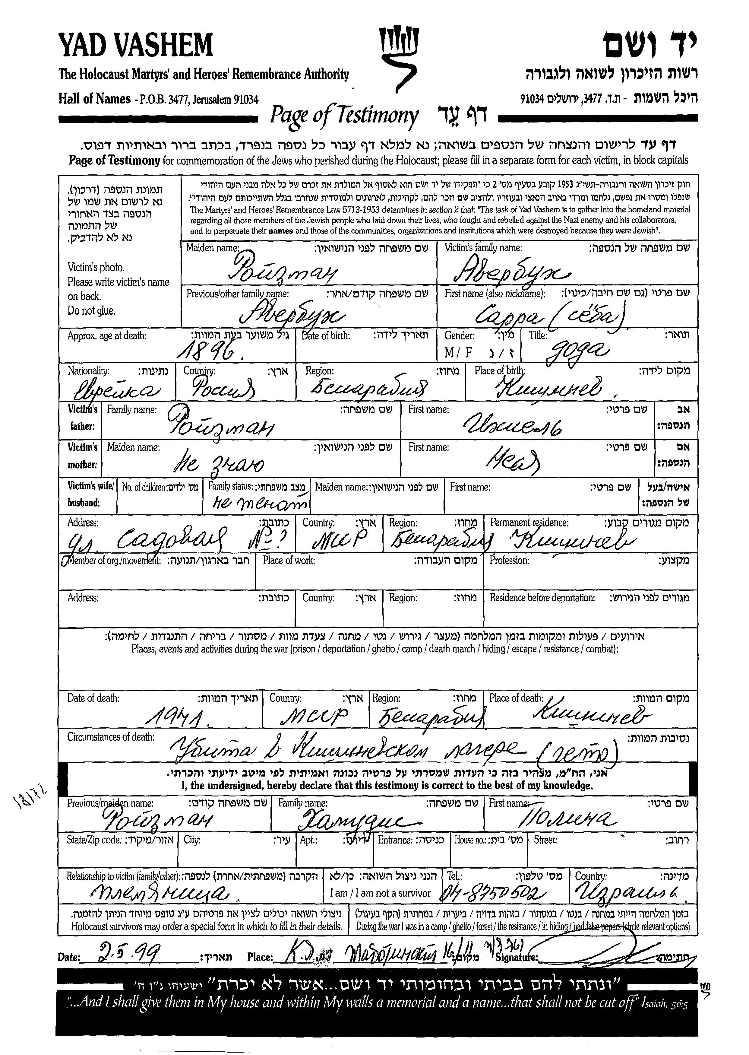 Sarra Syoba wurde in der Schoah ermordet. Todesort: Kishinev, Rumänien im Jahr 1941.