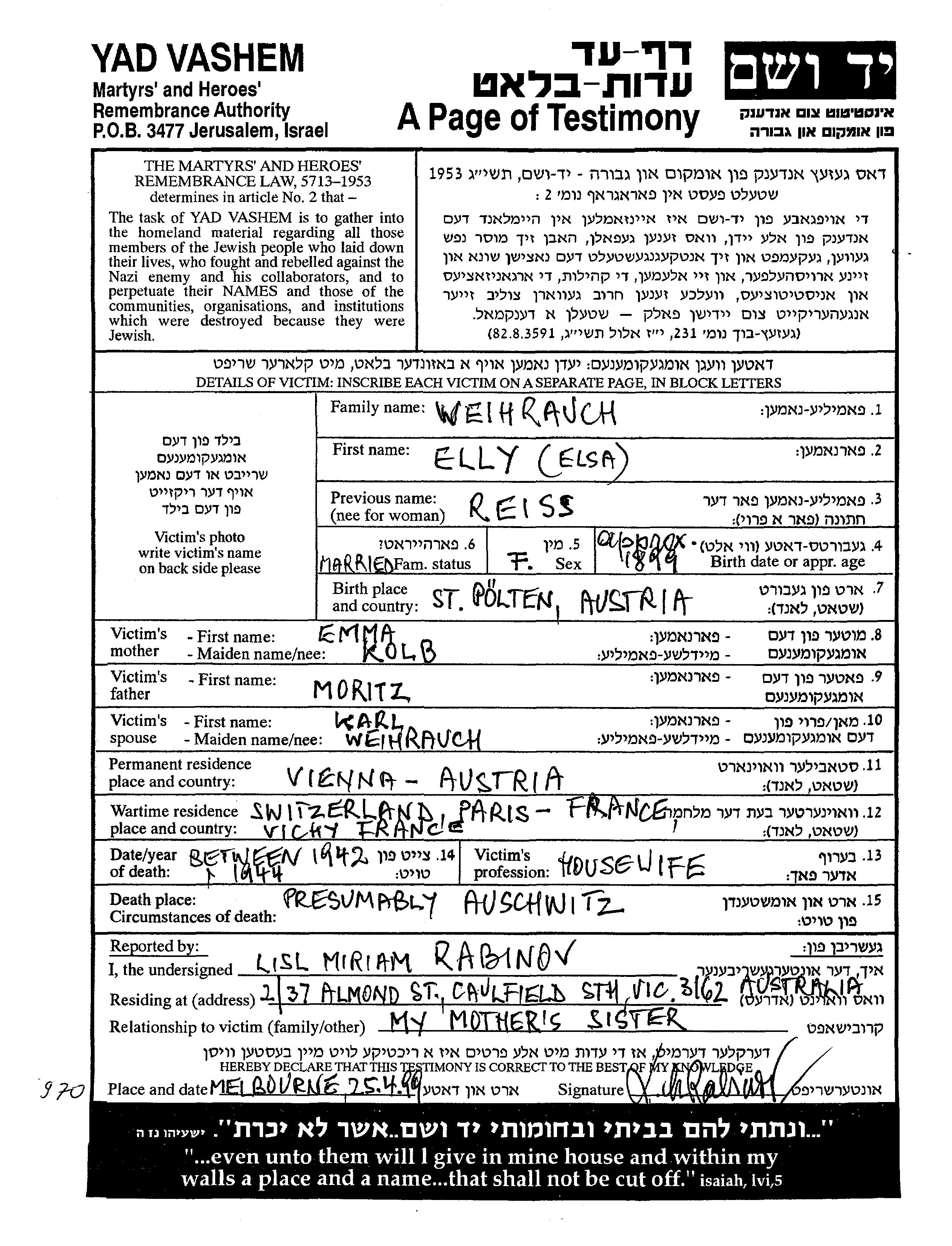 Elly Weihrauch, geb. Reiss wurde im Jahr 1899 in Poelten, Deutsches Reich geboren. Sie war die Tochter von Moritz und Emma. Sie war Hausfrau und mit Karl Verheiratet. Vor dem Zweiten Weltkrieg lebte sie in Vienna, Österreich. Während des Krieges war sie in Schweiz.