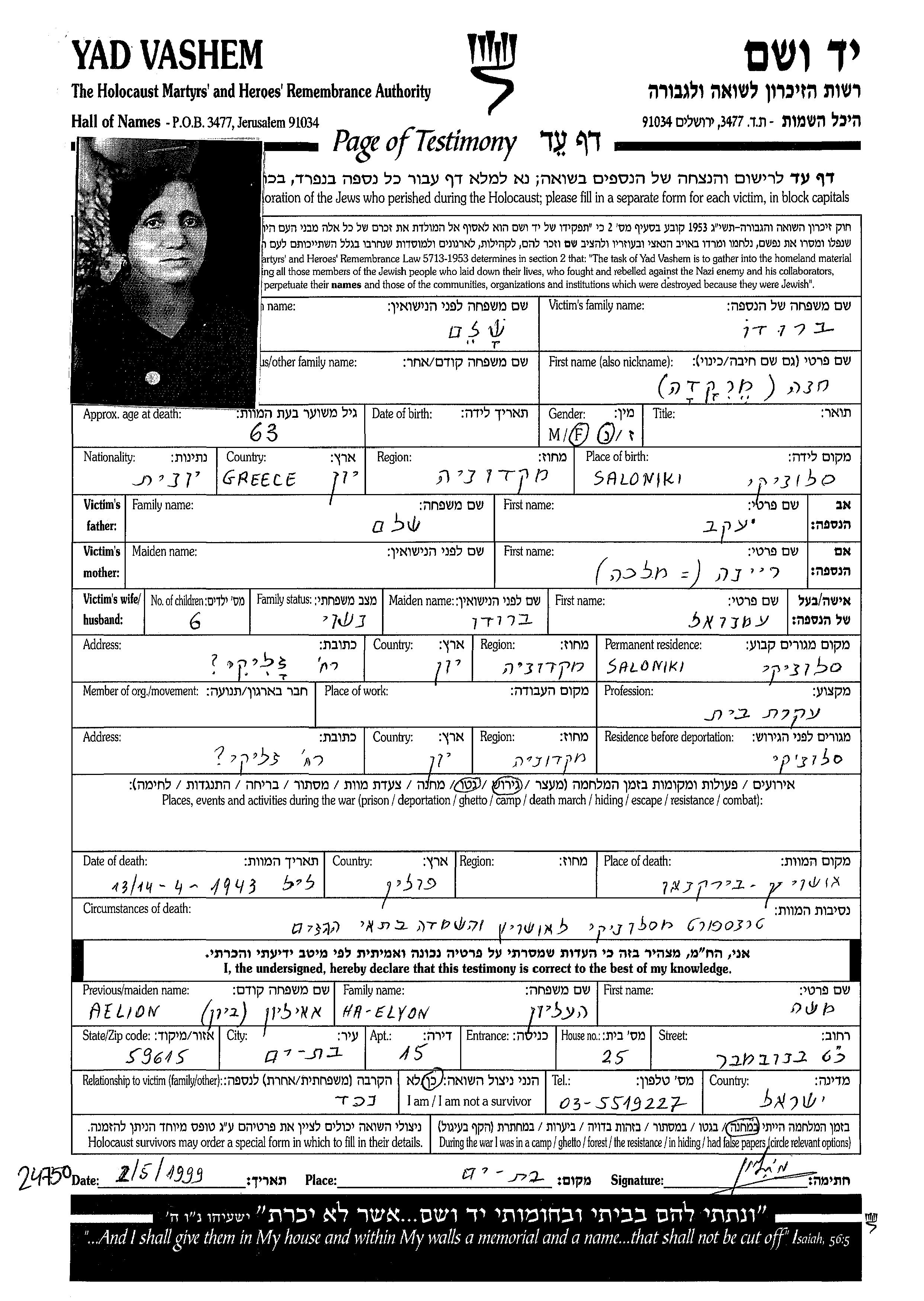 Broudo Merkada Khana Saloniki, Greece Page of Testimony