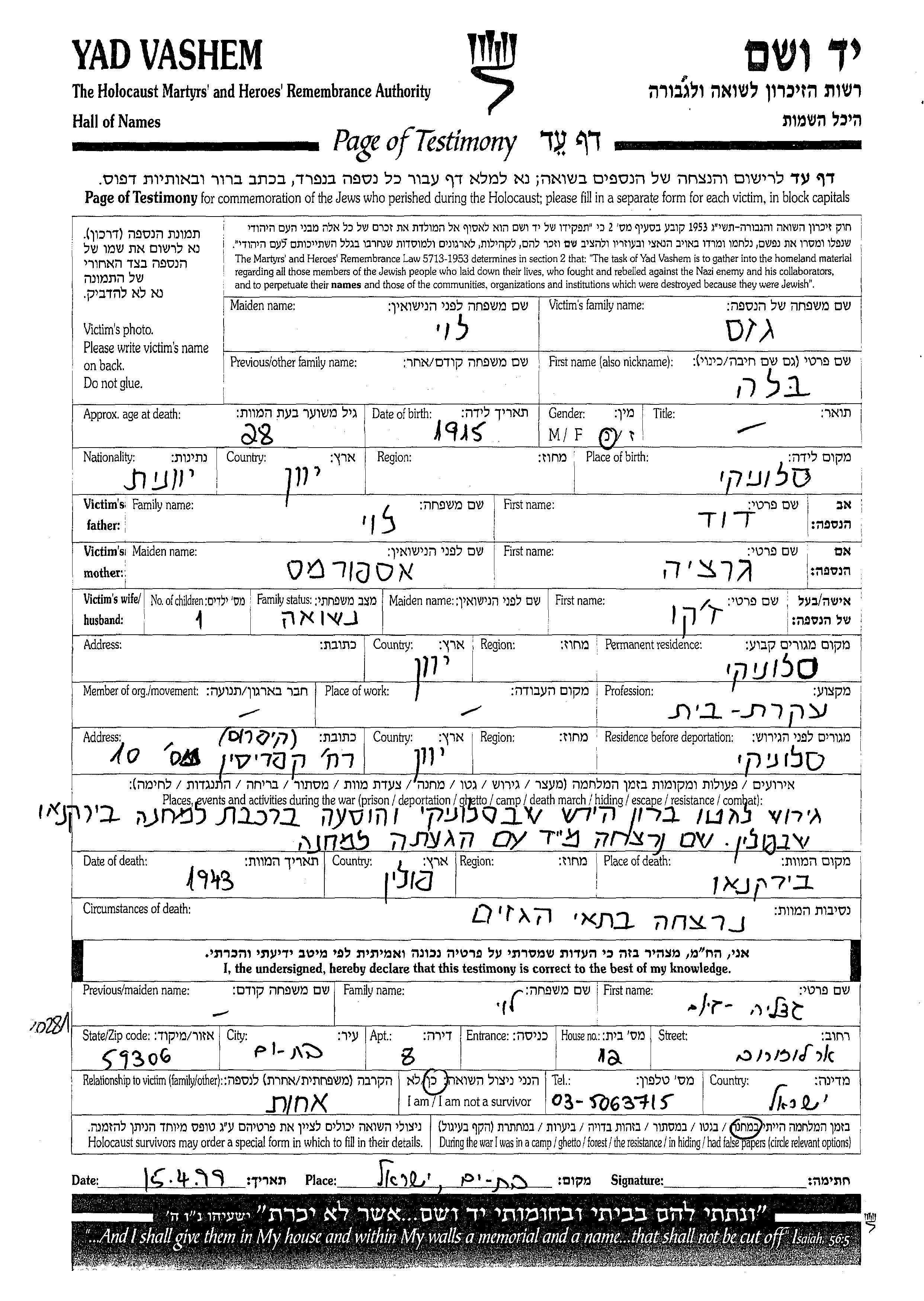 Search by last name of the submitter of the Page of Testimony, including diminutives or nicknames