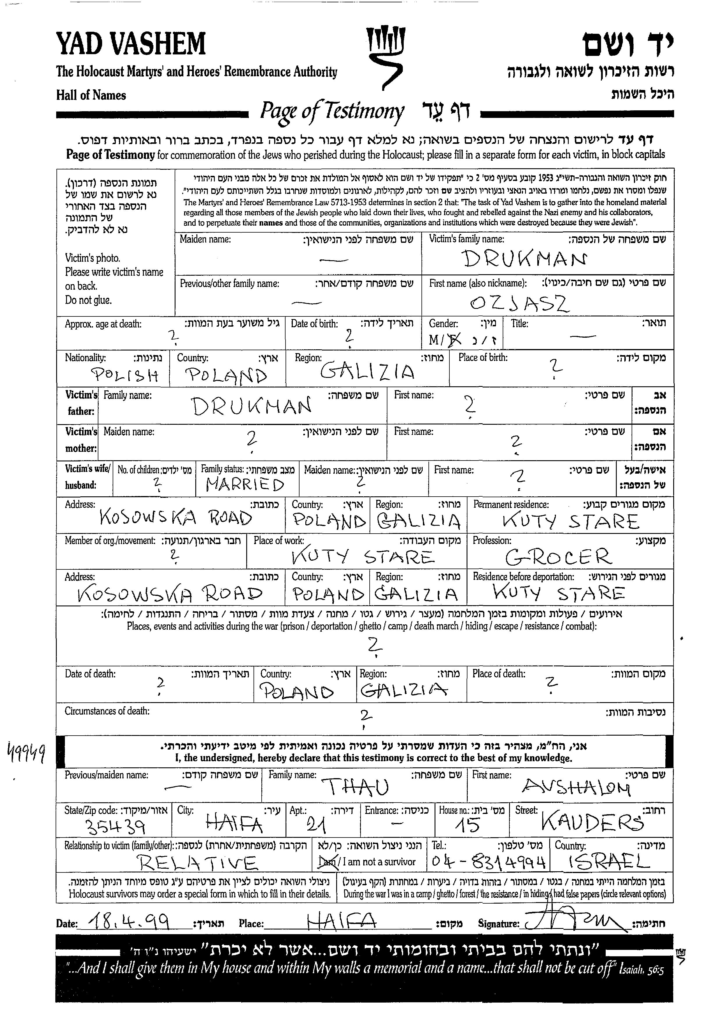 Drukman Ozjasz Radymno, Poland Page of Testimony
