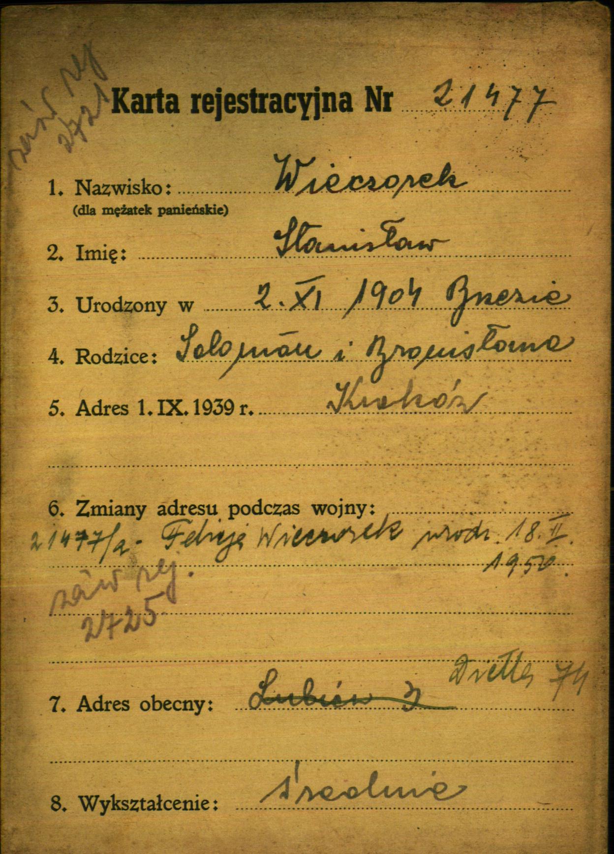 Stanisław Wieczorek was born in Brzezie, Poland, 1904 to Salomon and Bronisława. Prior to WWII he lived in Krakow, Poland.