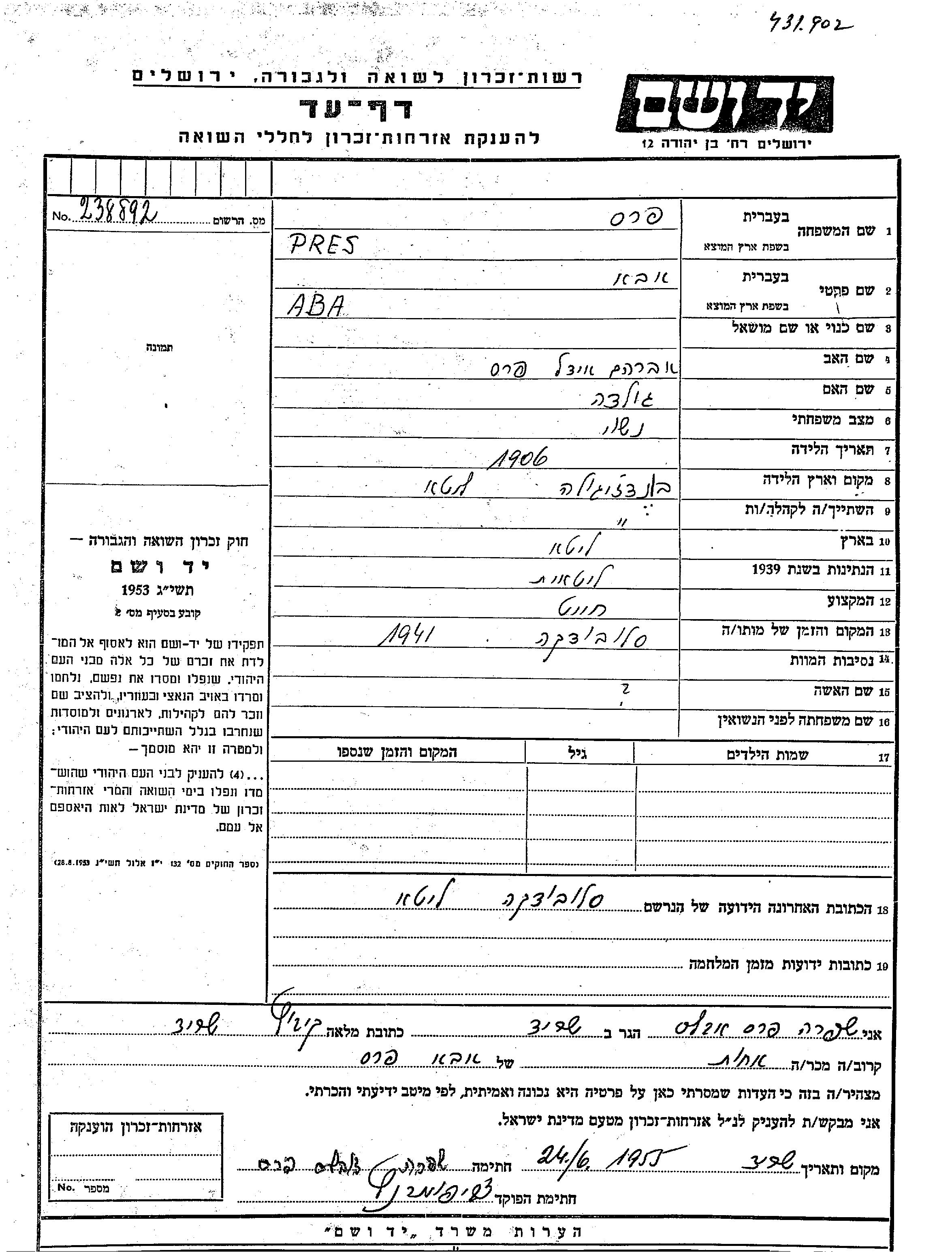 Aba Pres was born in Vandžiogala, Lithuania, 1906 to Avraham Idl and Golda. He was a tailor and married. Prior to WWII he lived in Vandžiogala, Lithuania. During the war he was in Slobodka, Lithuania. Aba was murdered in the Shoah. Place of death: Slobodka, Lithuania, 1941.