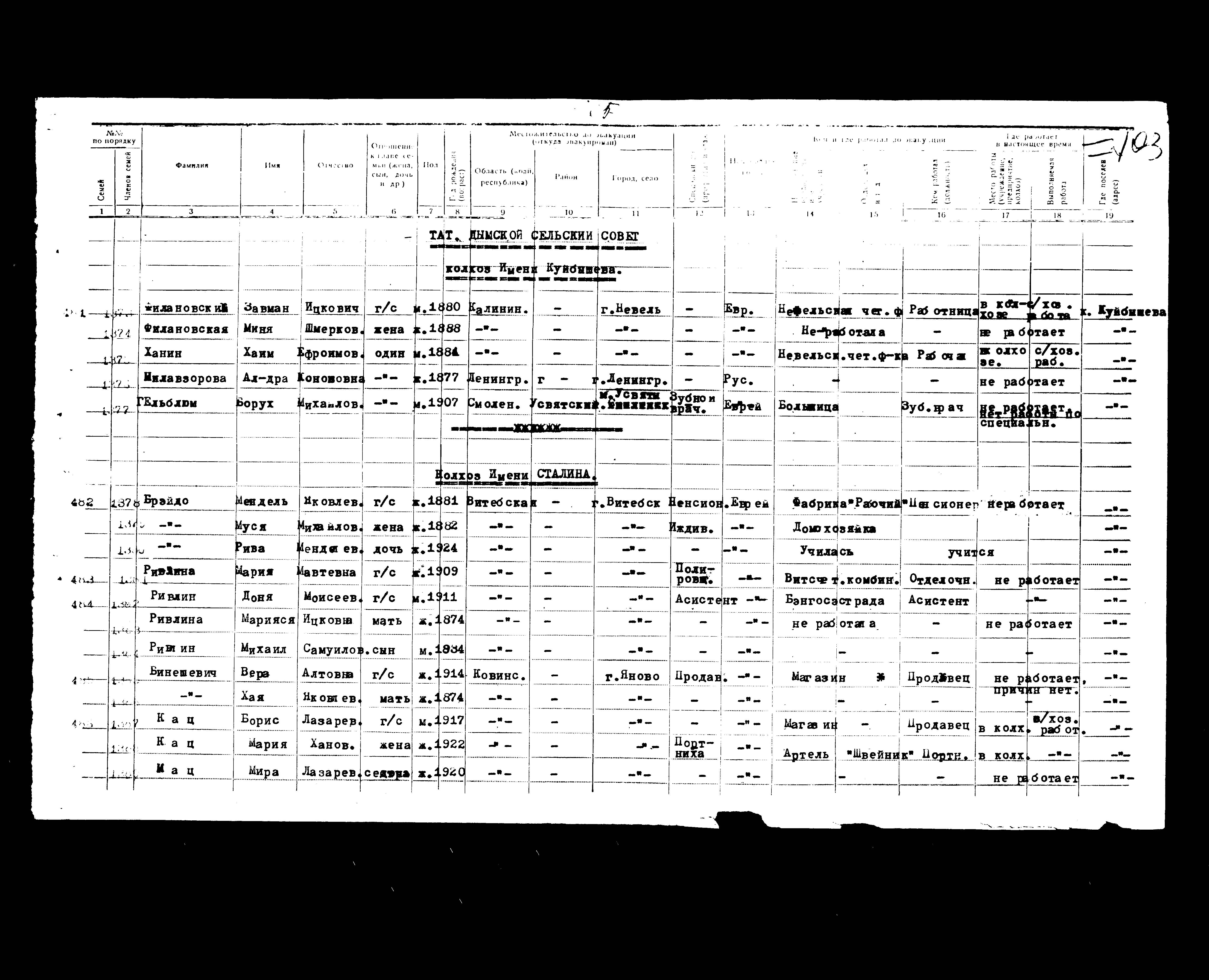 Borukh Gelblum was born, 1907 to Mikhail. He was a zubnoi vrach. Prior to WWII he lived in Usvyaty, Russia (USSR). During the war he was in Bavly, Russia (USSR). Borukh was registered following the evacuation/ in the interior of the Soviet Union.