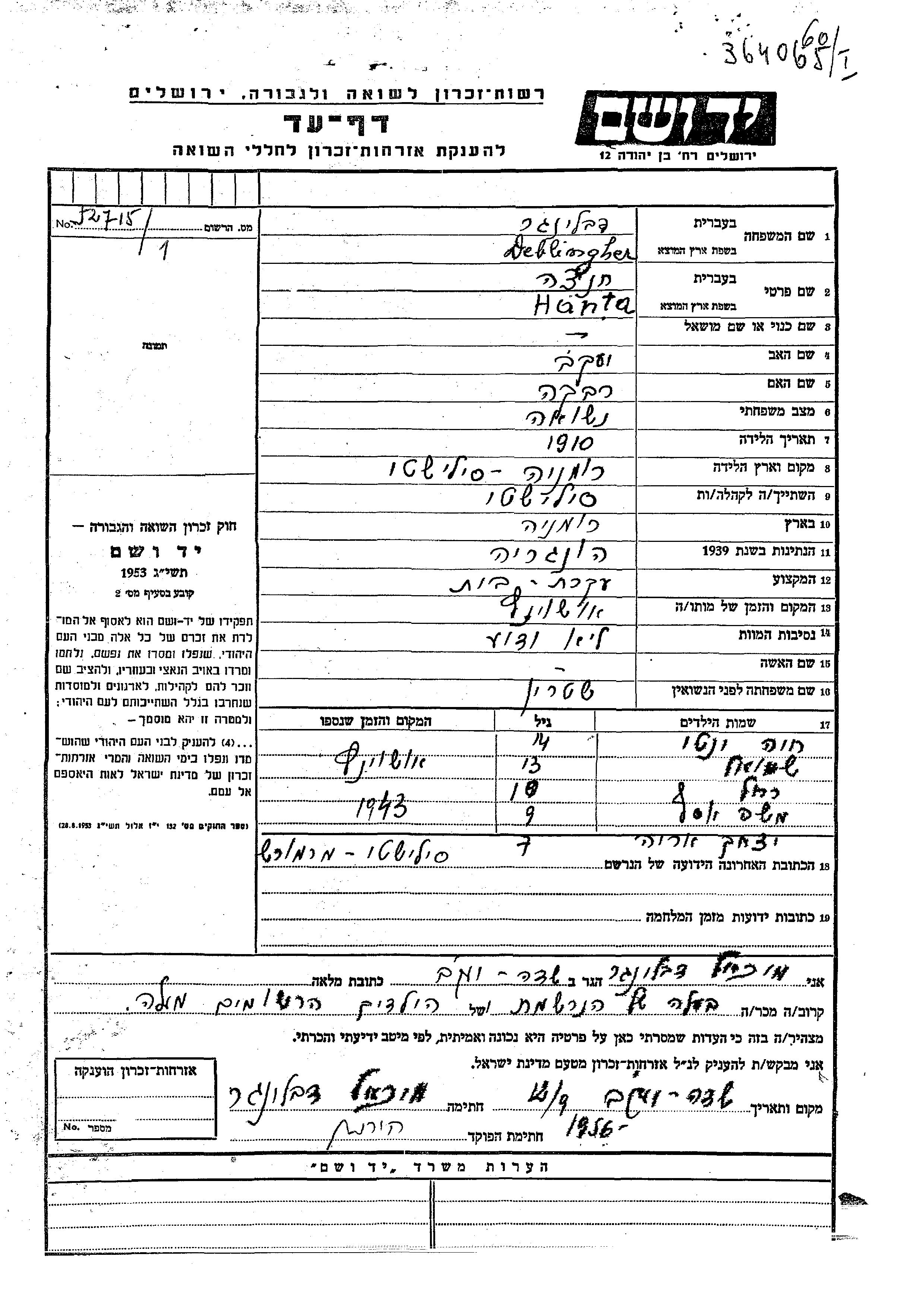 Deblingher Hanta 1910 Salistea, Romania Page of Testimony