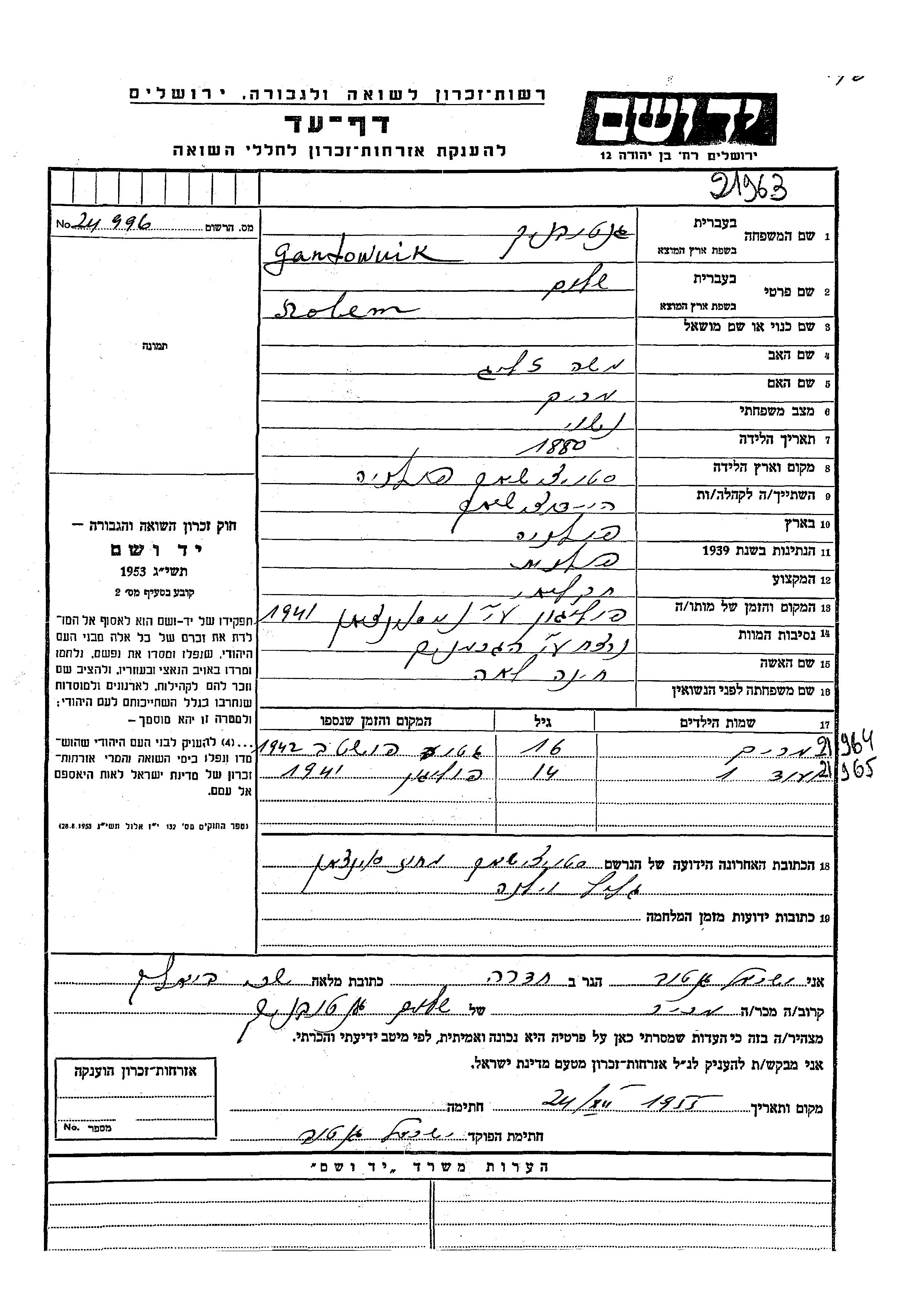 Szolem Gantownik was born in Stayetishkis, Poland, 1880 to Moshe Zelig and Miriam. He was an agriculturist and married to Khana Lea. Prior to WWII he lived in Stayetishkis, Poland. Szolem was murdered in the Shoah. Place of death: Poligon, Murder Site, 1941.