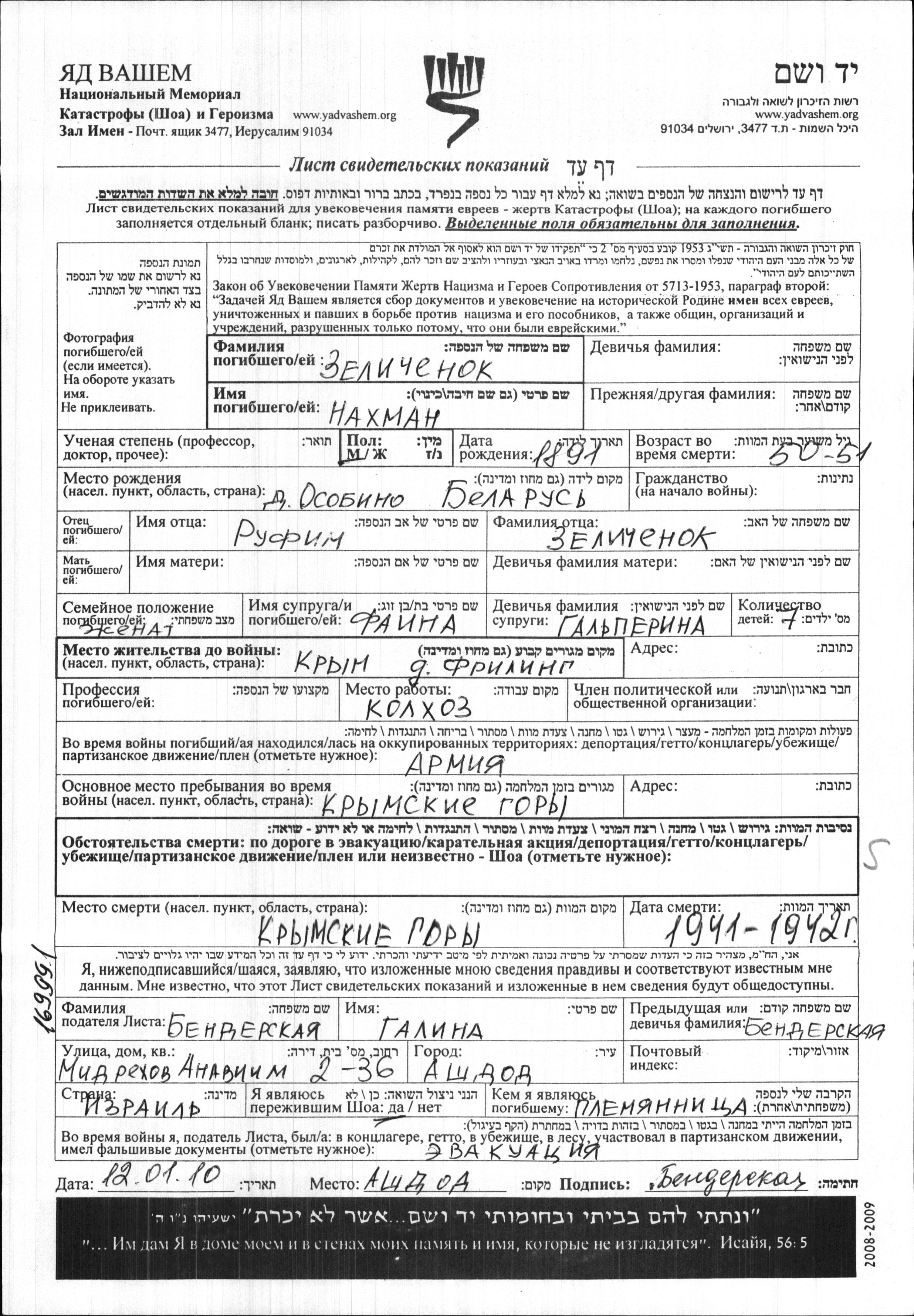 Nakhman Zelichenok was born in Osobin, Belorussia (USSR), 1891 to Rufim. He was married to Faina nee Galperina. Prior to WWII he lived in Friling, Russia (USSR). During the war he was in the Soviet armed forces. Nakhman was killed in military service in WWII. Place of death: Krym, USSR, 1941.