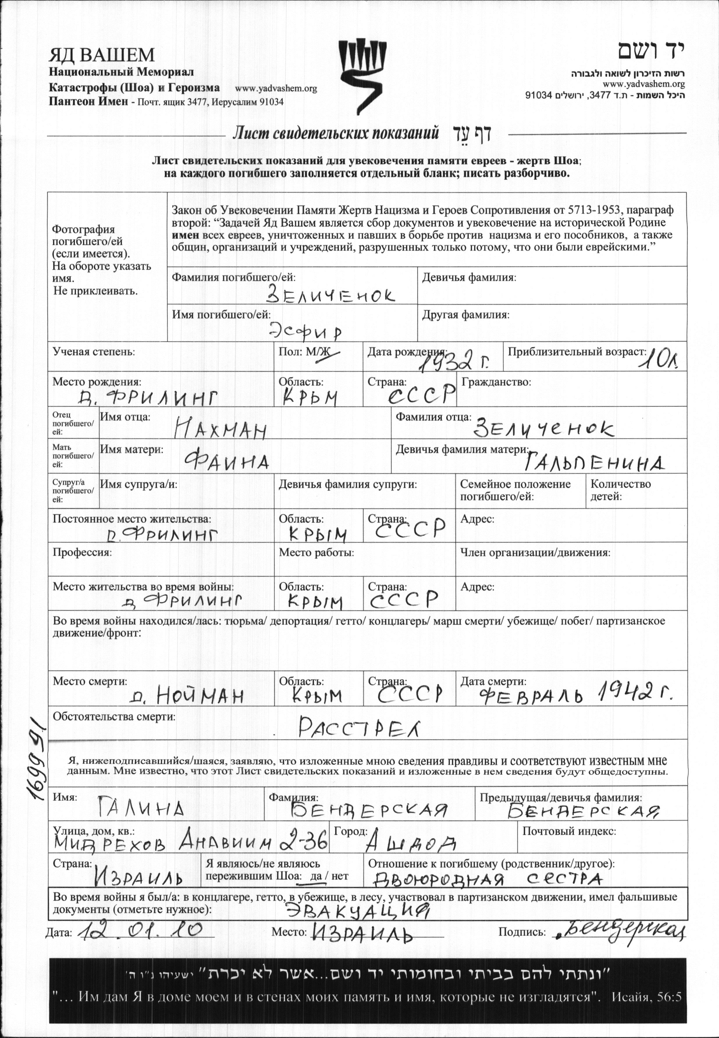 Zelichenok Esfir 1932 Friling, Russia (USSR) Page of Testimony