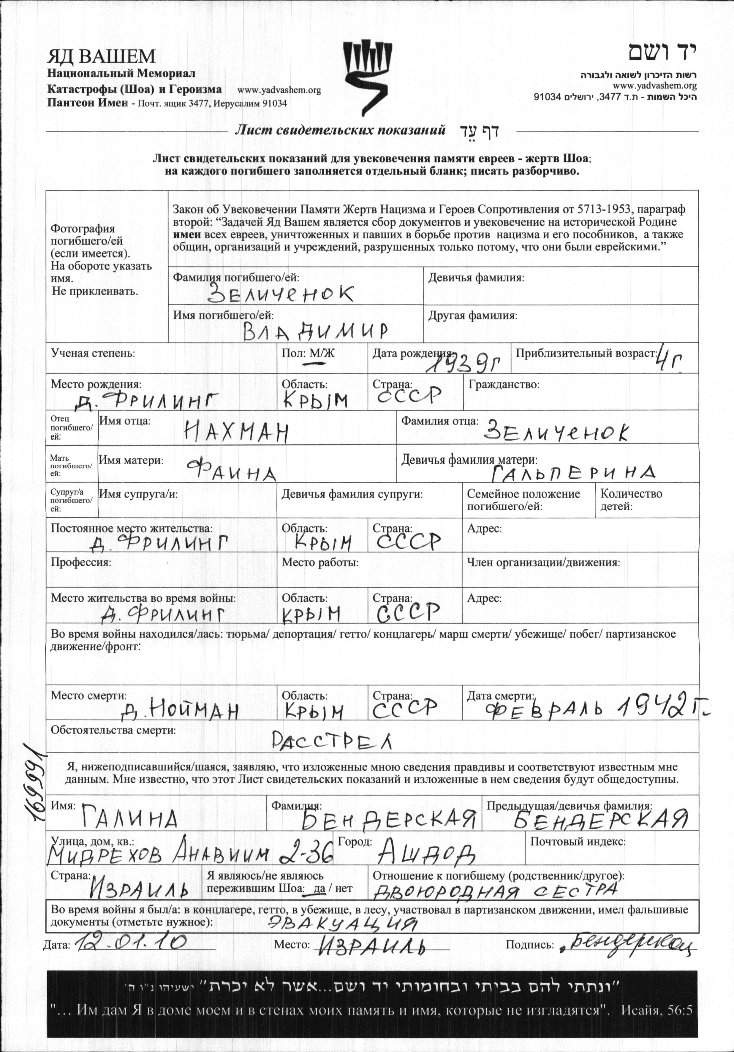 Zelichenok Vladimir 1939 Friling, Russia (USSR) Page of Testimony