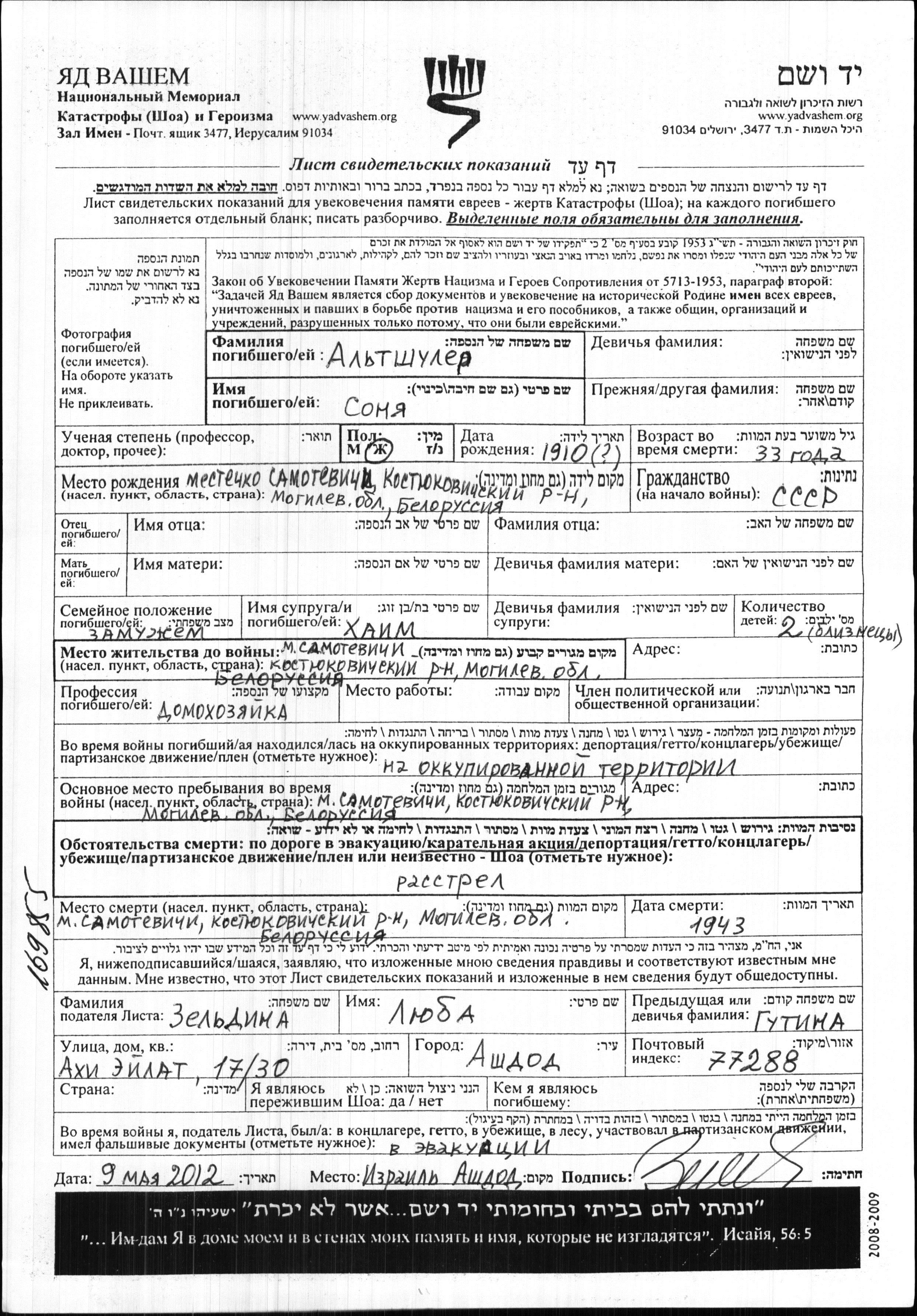Altshuler Sonya 1910 Samotevichi, Belorussia (USSR) Page of Testimony