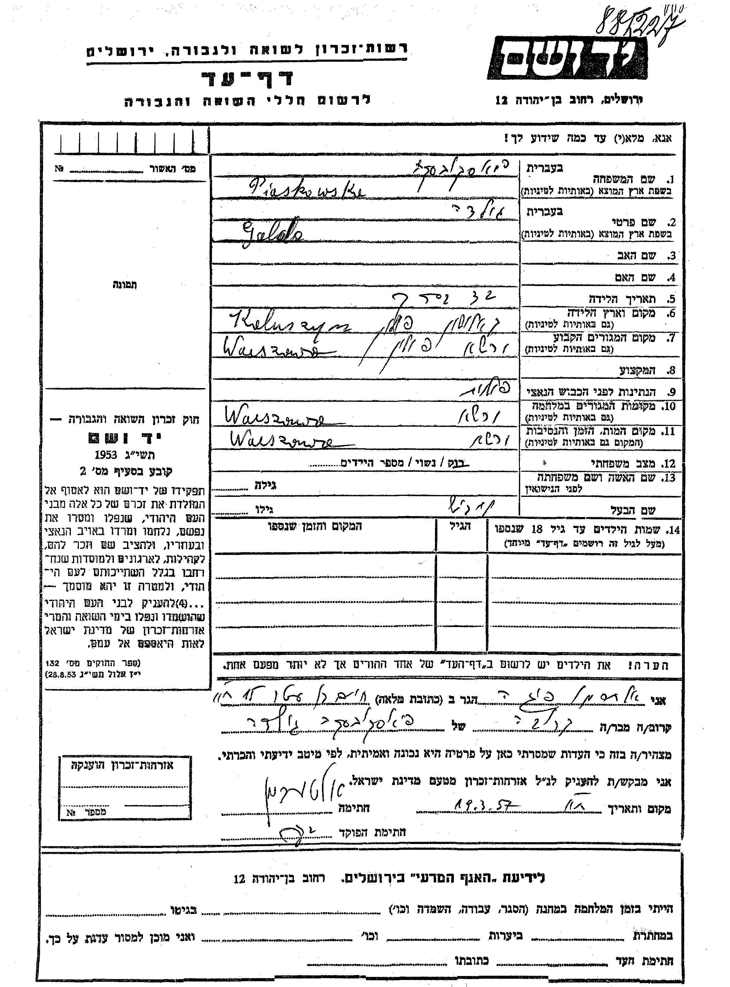 Golda Piaskowski was born in Kaluszyn, Poland. She was married to Leibish. Prior to WWII she lived in Warszawa, Poland. During the war she was in Warszawa, Poland. Golda was murdered in the Shoah. Place of death: Warszawa, Poland.