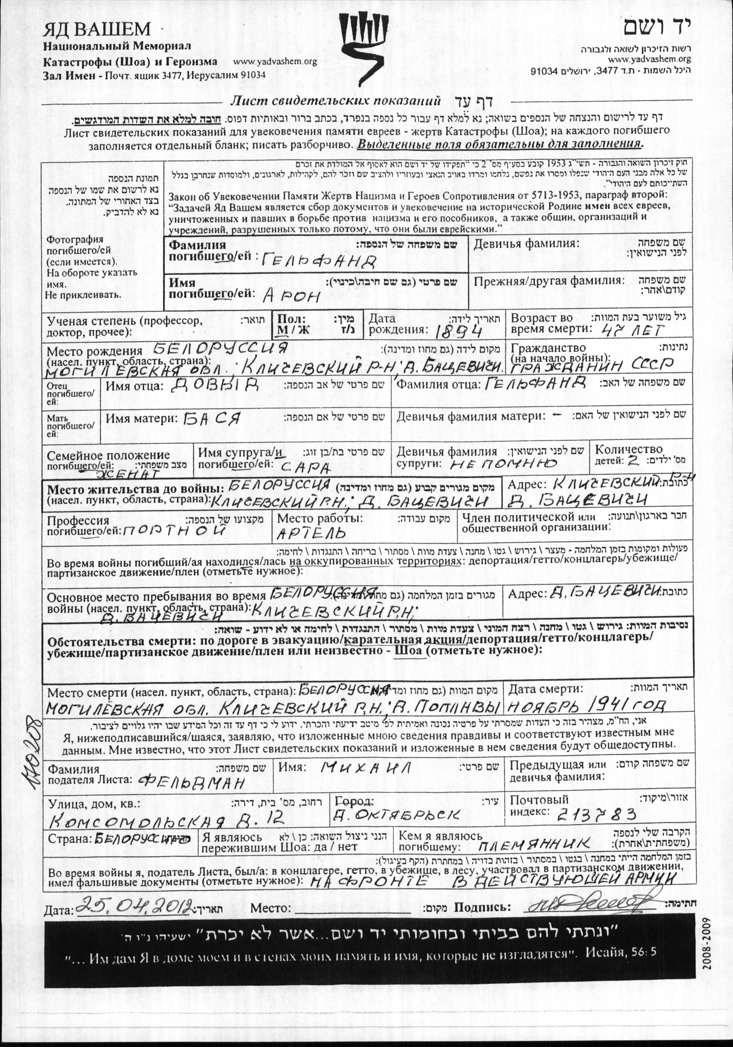 Aron Gelfand was born in Batsevichi, Belorussia (USSR), 1894 to Dovyd and Basya. He was a tailor and married to Sara. Prior to WWII he lived in Batsevichi, Belorussia (USSR). During the war he was in Batsevichi, Belorussia (USSR). Aron was murdered in the Shoah. Place of death: Poplavy, Belorussia (USSR), 11/1941.