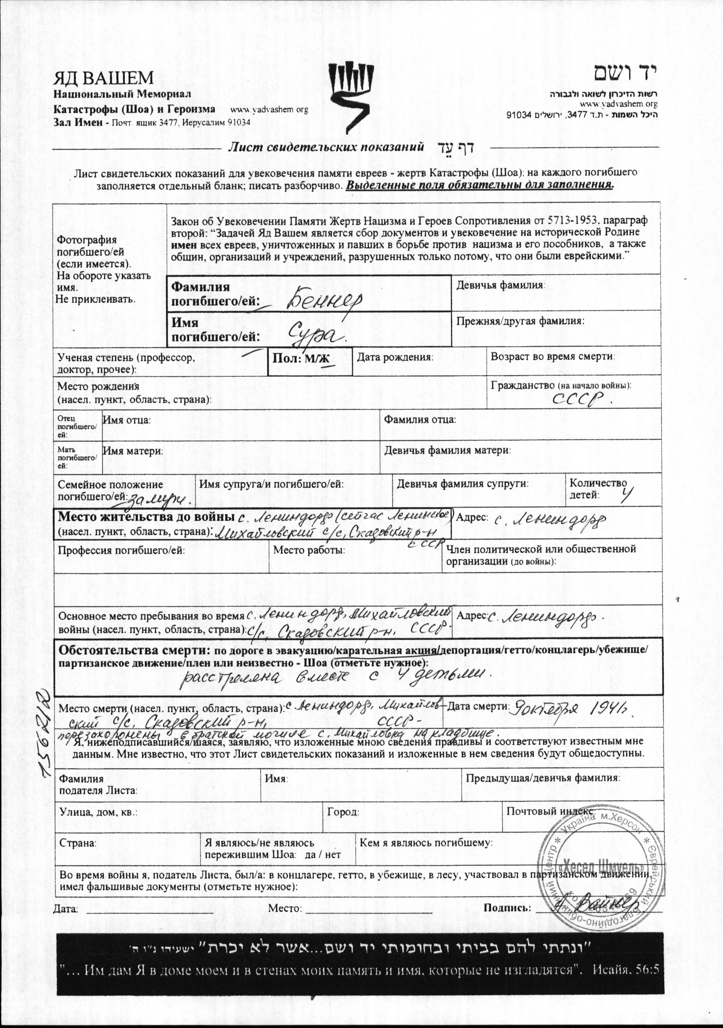Sura Benner. She was married. Prior to WWII she lived in Lenindorf, Ukraine (USSR). During the war she was in Lenindorf, Ukraine (USSR). Sura was murdered in the Shoah. Place of death: Lenindorf, Ukraine (USSR), 09/10/1941.