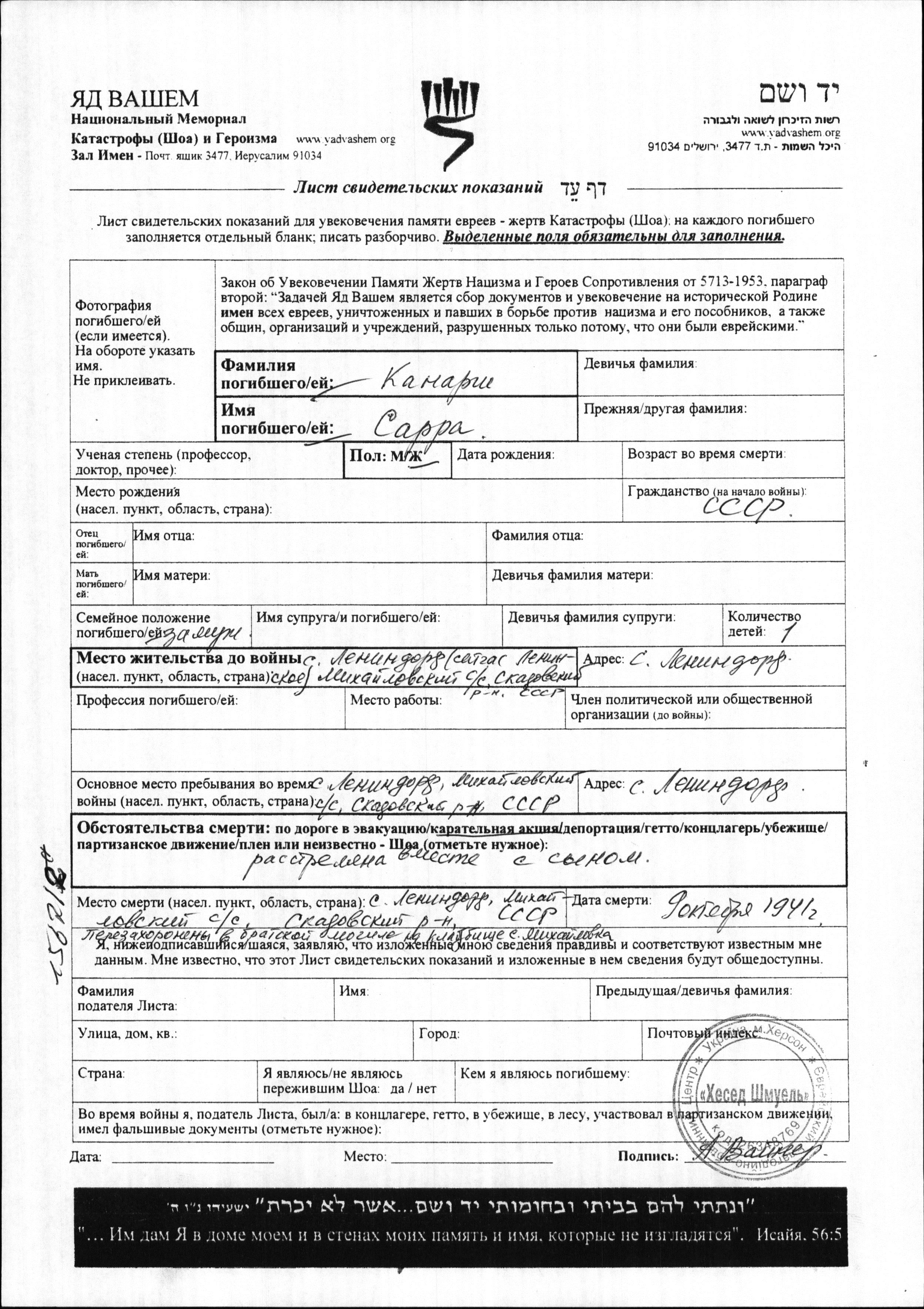Sarra Kanarsh. She was married. Prior to WWII she lived in Lenindorf, Ukraine (USSR). During the war she was in Lenindorf, Ukraine (USSR). Sarra was murdered in the Shoah. Place of death: Lenindorf, Ukraine (USSR), 09/10/1941.