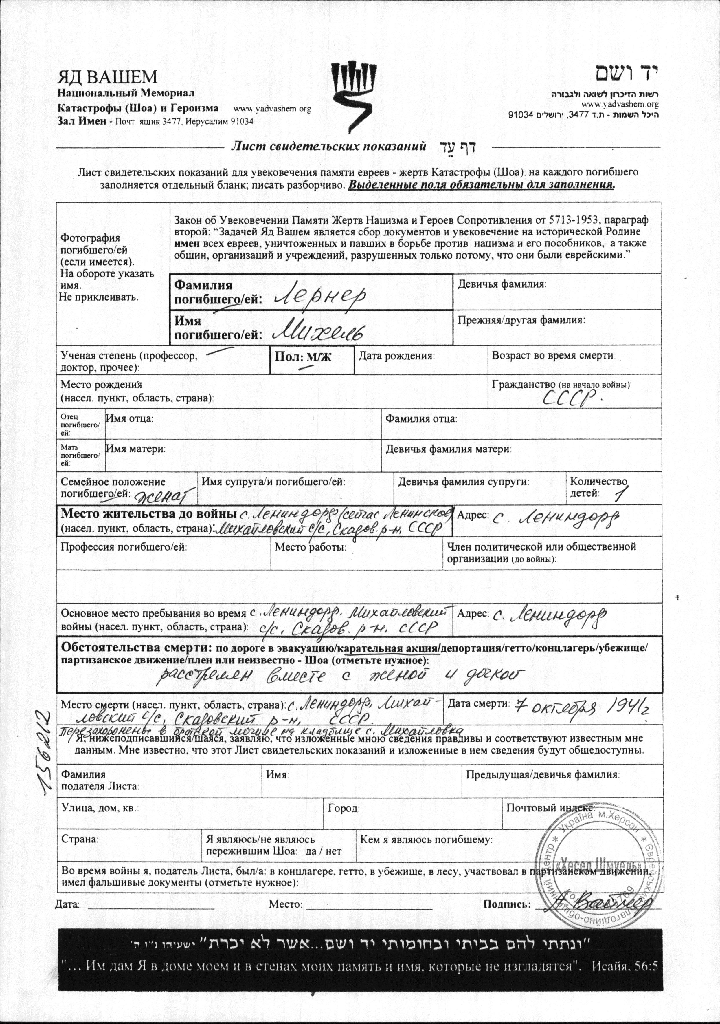 Mikhel Lerner. He was married. Prior to WWII he lived in Lenindorf, Ukraine (USSR). During the war he was in Lenindorf, Ukraine (USSR). Mikhel was murdered in the Shoah. Place of death: Lenindorf, Ukraine (USSR), 07/10/1941.