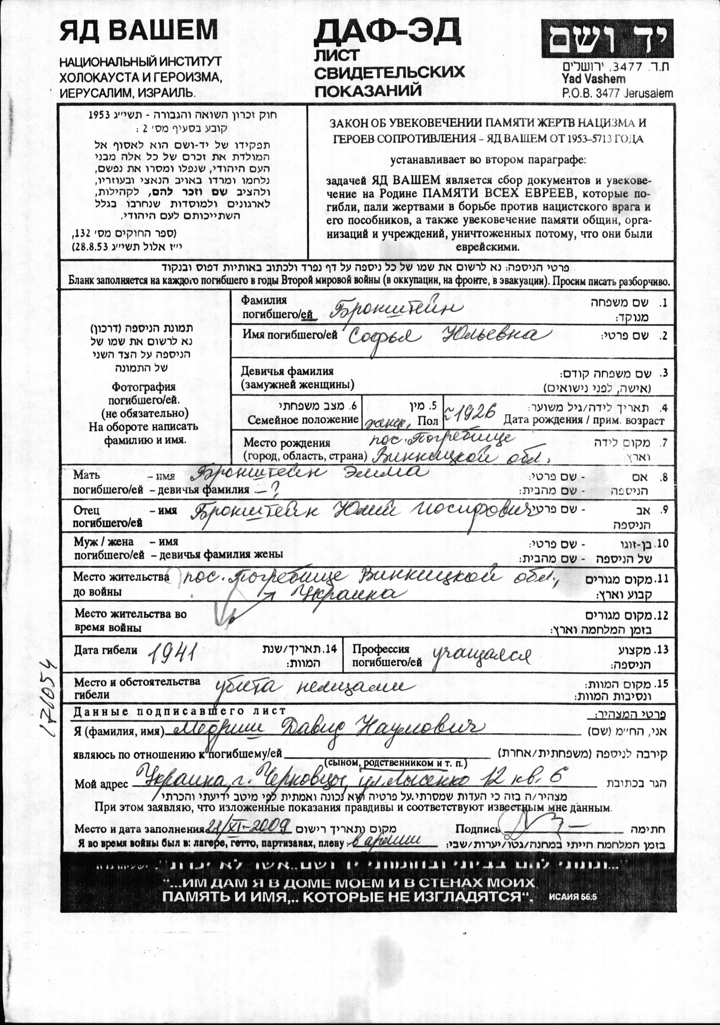 Sofia Bronshteyn was born in Pogrebishche, Ukraine (USSR), 1926 to Yuli and Emma. She was a pupil and teenager. Prior to WWII she lived in Pogrebishche, Ukraine (USSR). During the war she was in Pogrebishche, Ukraine (USSR). Sofia was murdered in the Shoah. Place of death: unknown, 1941.
